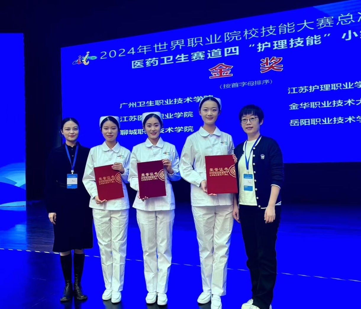 护理技能小组(赛项)共有来自全国各地61支队伍的216名选手参赛。我校参赛选手卢荟芳、郝丽杰、马刘浩合与指导老师邢爽、岳静组成的代表队获得金奖。