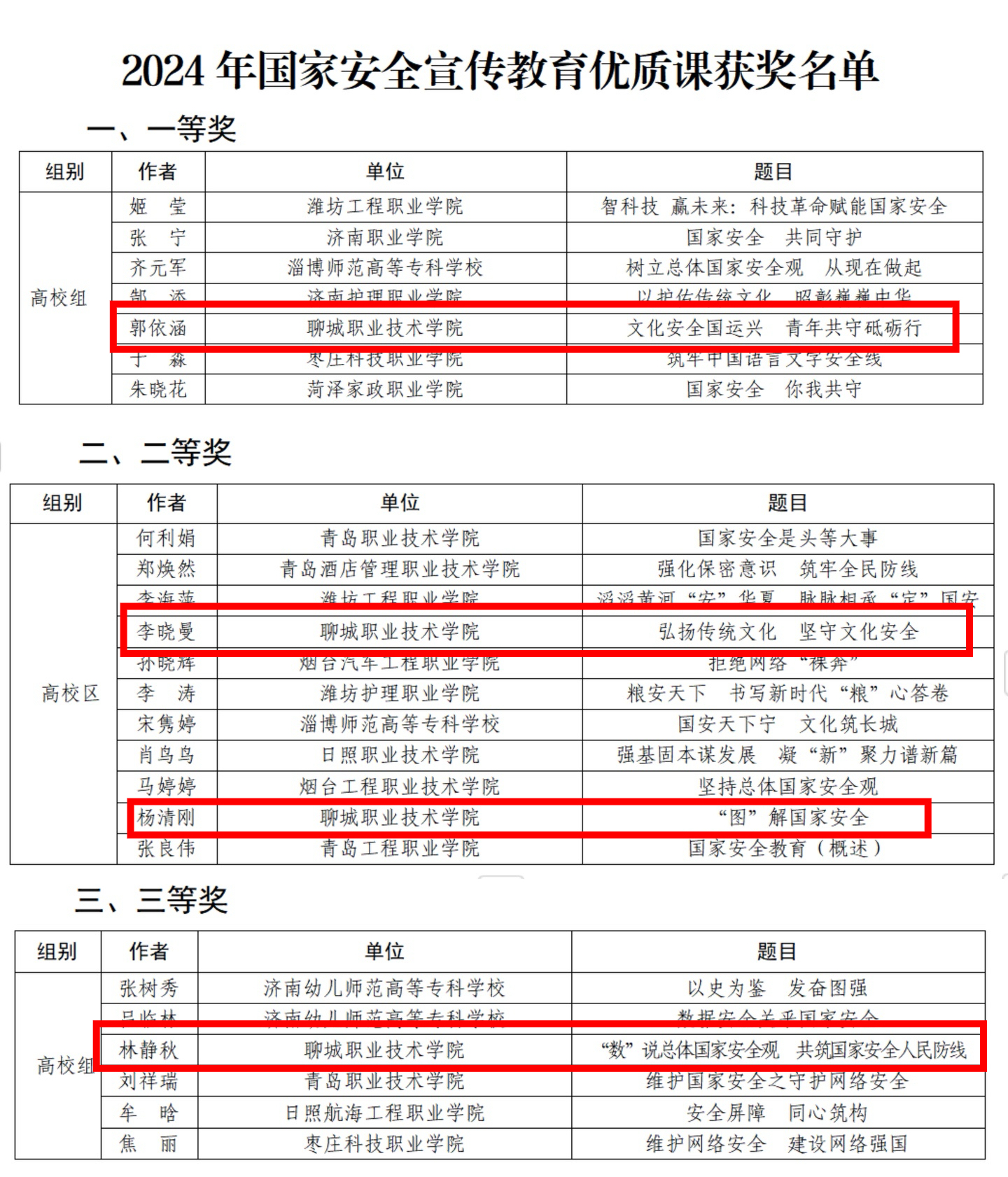 近日,山东省教育厅主办的2024年山东省国家安全宣传教育系列活动评选结果公布,聊城职业技术学院在此次活动中荣获15项奖项。