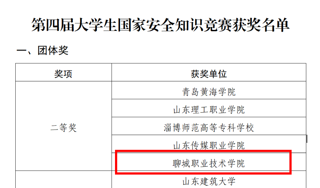 在山东省第四届大学生国家安全知识竞赛中,经过初赛、复赛和决赛,共评选出获奖高校16个,其中特等奖1个、一等奖2个、二等奖5个、三等奖8个。学生个人共评选出一等奖100名、二等奖200名、三等奖300名。优秀指导老师35名。其中,聊城职业技术学院代表队获“团体二等奖”;2名同学获个人一等奖,4名同学获二等奖,3名同学获三等奖;1名教师获评“优秀指导教师”。