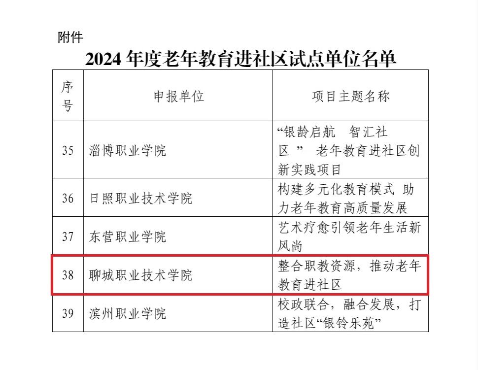 近日,山东省社区教育指导服务中心下发《关于公布2024年度老年教育进社区试点单位的通知》,聊城职业技术学院申报的“整合职教资源,推动老年教育进社区”项目获评山东省“老年教育进社区”试点项目。