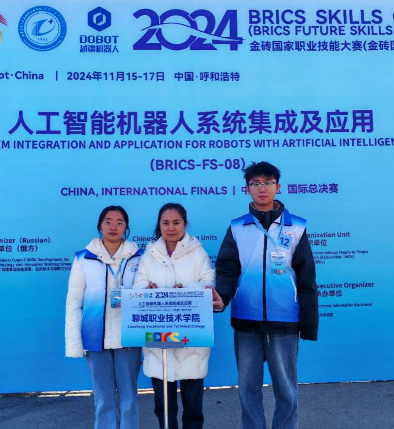 11月15日至17日,2024金砖国家职业技能大赛人工智能机器人系统集成及应用赛项国际总决赛在内蒙古电子信息职业技术学院举行。经过激烈角逐,聊城职业技术学院智能制造学院学生胡渭东、董晓燕斩获二等奖,指导老师王苗苗、陈睿获优秀指导老师。