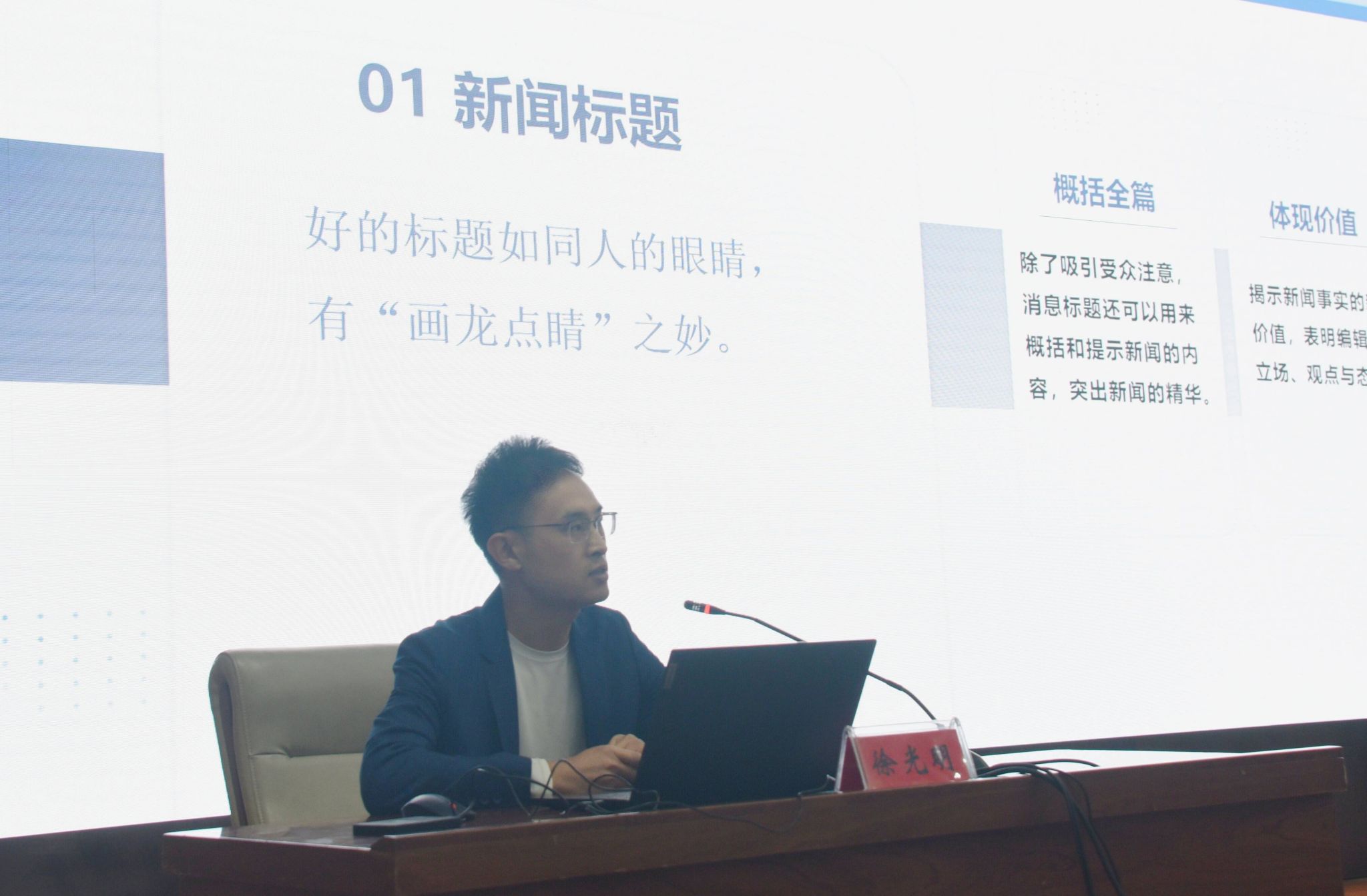 本场讲座,学校党委宣传部的徐光明以《新闻采编创新意识与能力提升》为题,从“新闻报道的文体类型”“新闻写作创新意识”“校园新闻的写作方法”“新闻编辑提升”等四个方面,结合最新揭晓的34届中国新闻奖获奖新闻和《新华网》《人民日报》等主流媒体发布的高校好新闻,用“理论+案例对比”的形式,对新闻写作和编辑工作的相关知识和注意事项进行详细阐释。