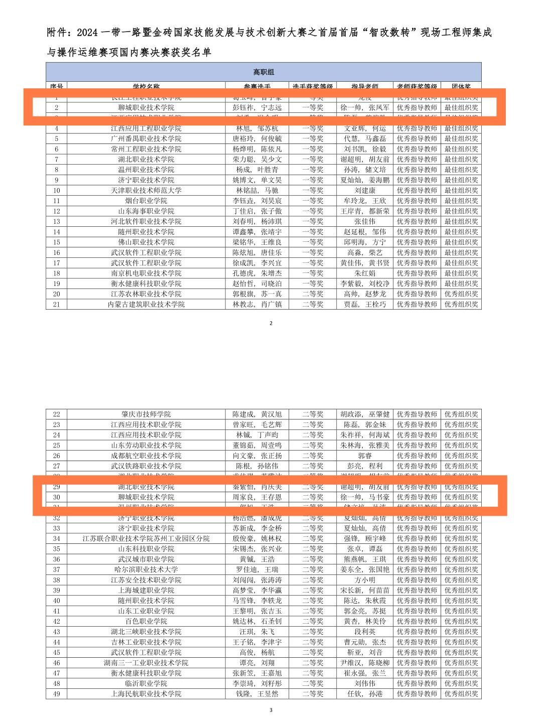 近日,2024年“一带一路”暨金砖国家技能发展与技术创新大赛首届“智改数转”现场工程师集成与操作运维赛项全国总决赛落下帷幕。聊城职业技术学院智能制造学院彭钰祚、宁志远获得一等奖(指导教师:徐一帅、张凤军)的好成绩,周家良、王存恩获得二等奖(指导老师:徐一帅、马书豪),张凤军、徐一帅、马书豪获得“优秀指导教师”称号,聊城职业技术学院获得“优秀组织奖”。