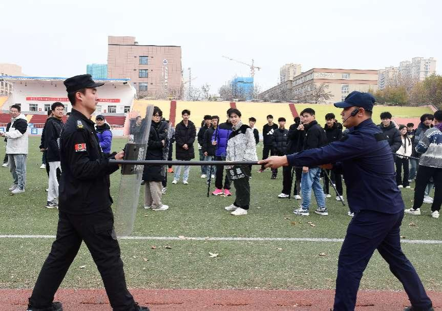 反恐防暴技能了然于心,12月3日,学生工作部联合保卫科共同组织反恐防暴演练培训。聊城市公安局东昌府分局特巡警大队郭默龙教官应邀到校进行培训,学生社区辅导员及学生干部、物业公寓管理。教官在培训现场讲解并演示了警用器械和防暴装备的使用方法,详细讲解反恐防暴相关知识及团队协作制服危险人员的方法。全体参训人员进行了防暴技能专项培训,进一步筑牢了学生社区的安全体系,提升社区师生及管理人员的反恐防暴防范意识以及应对处置突发事件的能力。