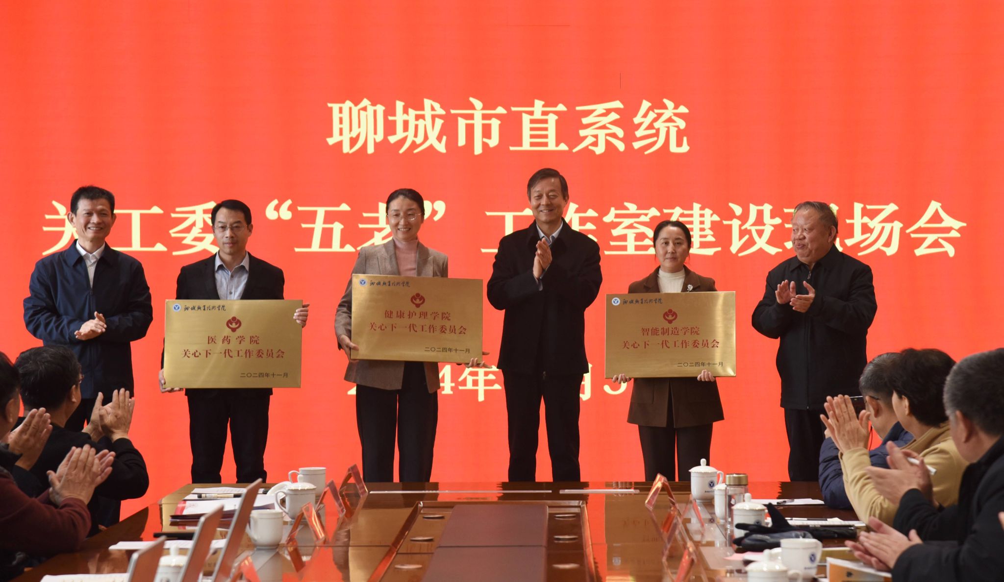李友渔传达了《关于学习贯彻市委市政府主要领导同志批示精神的通知》,刘强、靳凤莲共同为聊城职业技术学院关心下一代党史国史教育基地揭牌;李友渔、徐龙海共同为健康护理学院、医药学院、智能制造学院三个二级学院关工委授牌。