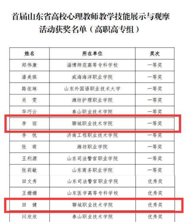 近日,山东省大学生心理健康教育专业委员会2024年年会暨首届高校心理教师教学技能展示与观摩活动在聊城大学举办,我校心理健康教育中心教师李丽获得高职高专组一等奖,田健获得高职高专组优秀奖。