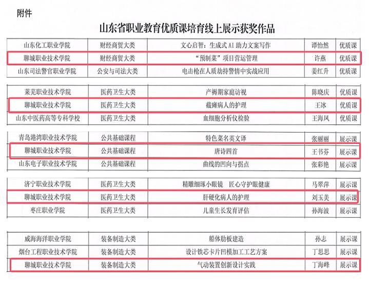 近日,山东省职业技术教育学会公布了2024年度山东省职业教育优质课培育线上展示作品评选结果,聊城职业技术学院获评2门优质课、3门展示课。