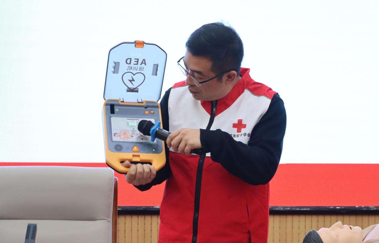 AED使用培训环节,专家详细地介绍了AED的使用方法,强调了AED在紧急救治中的关键作用以及把握急救“黄金时段”进行救援的重要性。并强调了使用AED时的注意事项:第一,对现场进行初步评估、判断患者意识及生命体征;第二,开展相应的急救措施。随后,专家现场演示了AED的操作流程,并重点讲解张贴电极片、插电检查心率、按键除颤、与胸外心脏按压配合等环节的操作要领和流程。