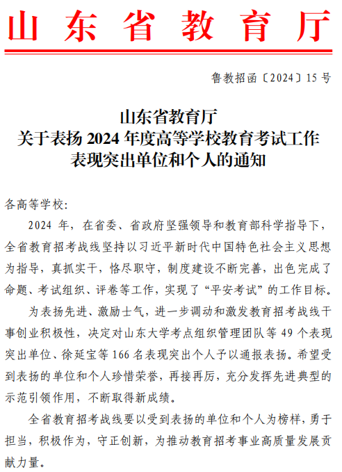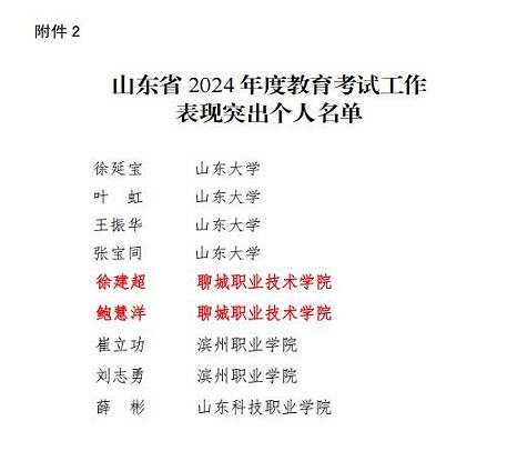12月24日,山东省教育厅发文对在2024年度高等学校教育考试工作中表现突出的单位和个人予以通报表扬。聊城职业技术学院考点组织管理团队获得山东省2024年度教育考试工作表现突出单位荣誉称号,团队成员徐建超、鲍慧洋获得山东省2024年度教育考试工作表现突出个人荣誉称号。