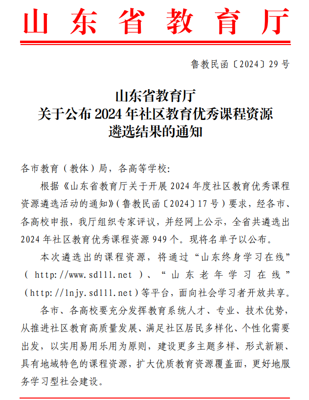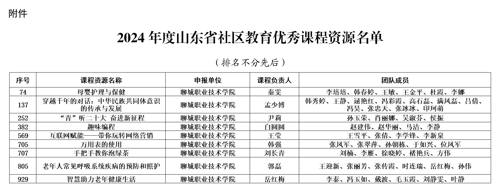 近日,山东省教育厅网站公布了2024年度山东省社区教育优秀课程资源遴选结果,聊城职业技术学院9门课程被认定为山东省社区教育优秀课程资源。