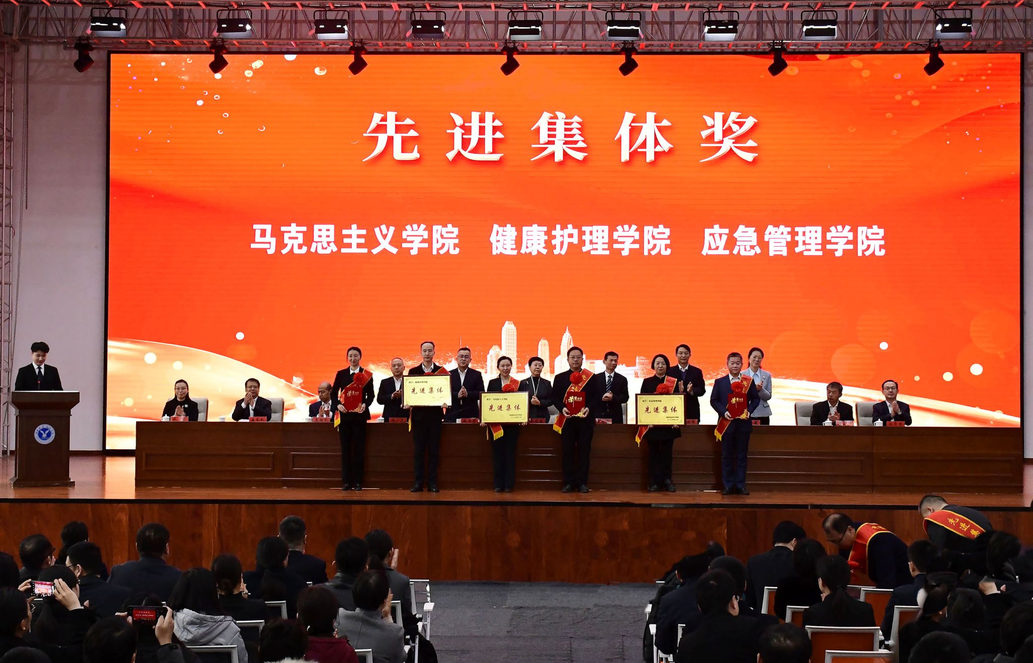 大会对教务处等9个先进集体,医药学院等2个技能大赛贡献奖,财务处等2个服务保障贡献奖,基础部等2个工作效能进步奖,于倩倩等149名先进个人进行颁奖。马克思主义学院、教务处、质量管理处、学生工作部、应急管理学院、医药学院主要负责同志作了典型发言。