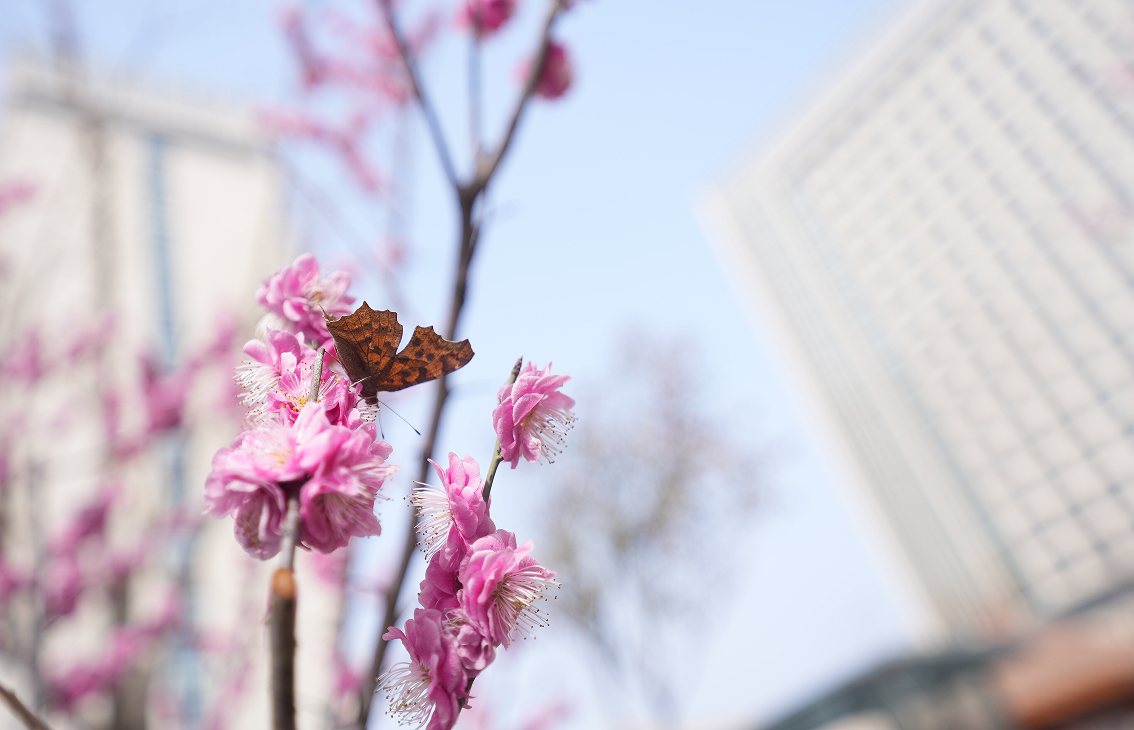 在新芽与暖阳的陪伴下,梅花独自散发着冷香,诉说着冬与春的浪漫交接,成为这乍暖还寒时节里最独特的景致。