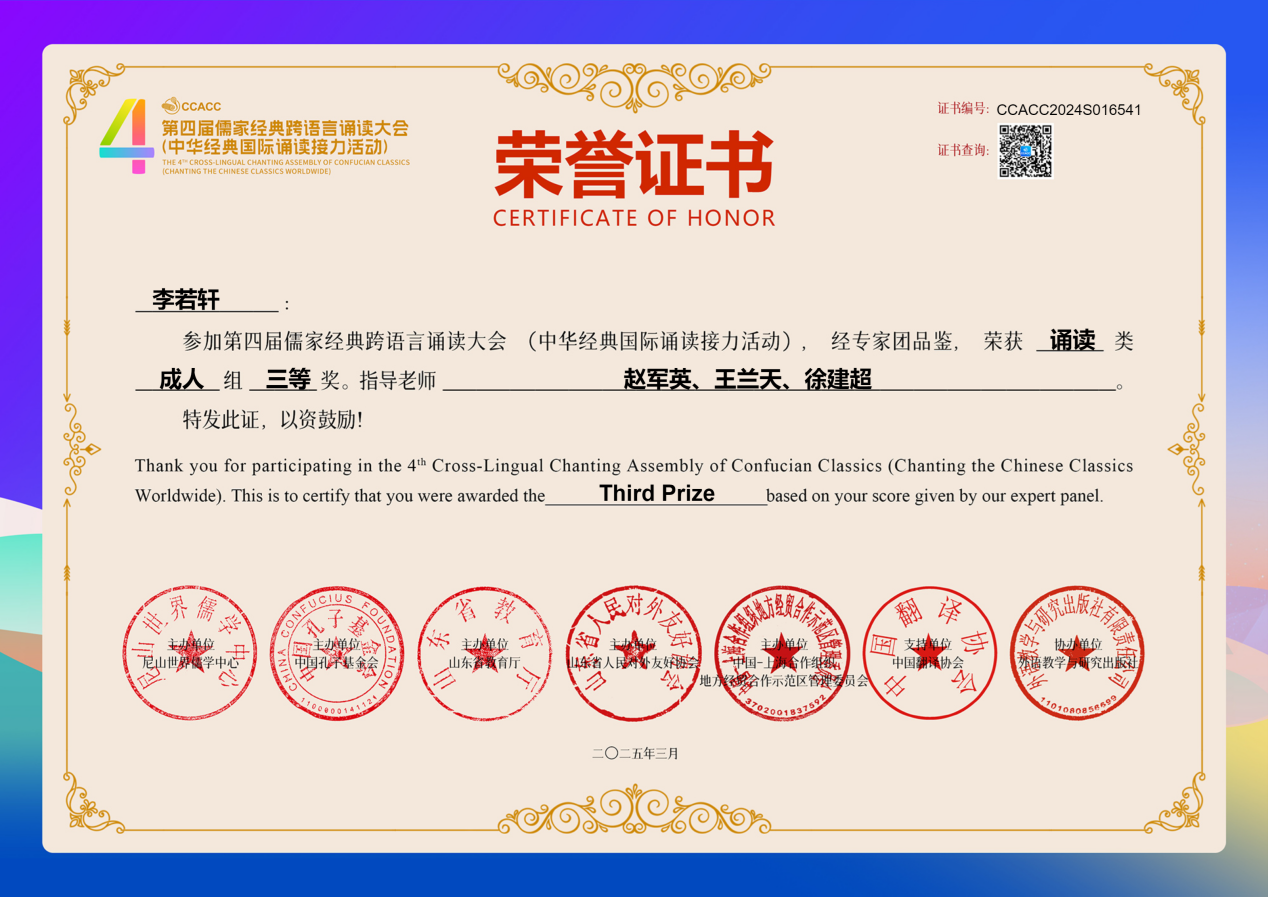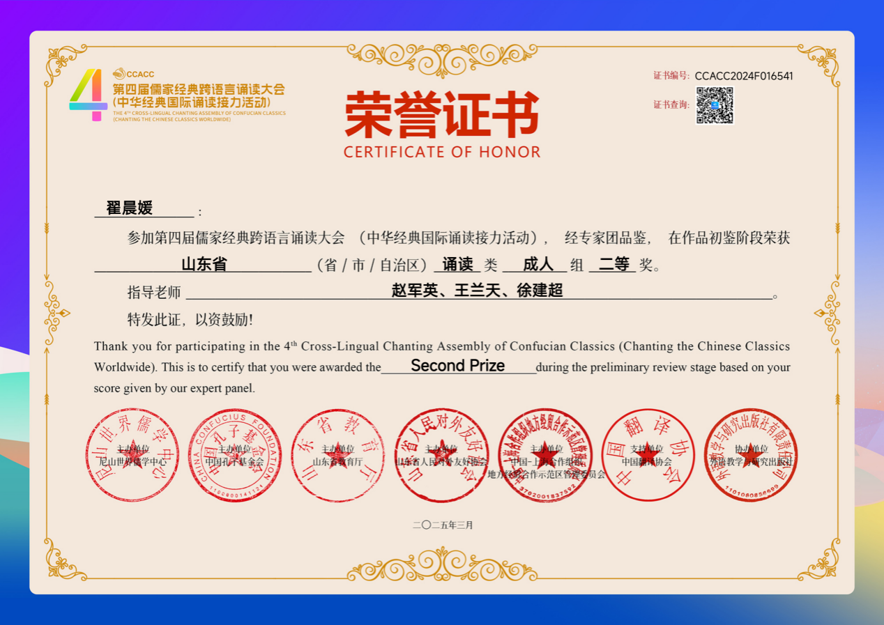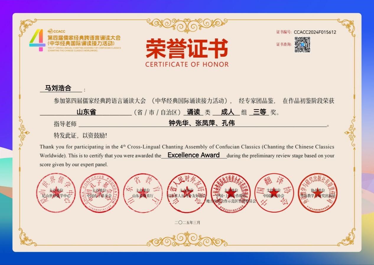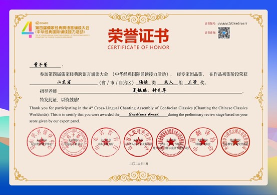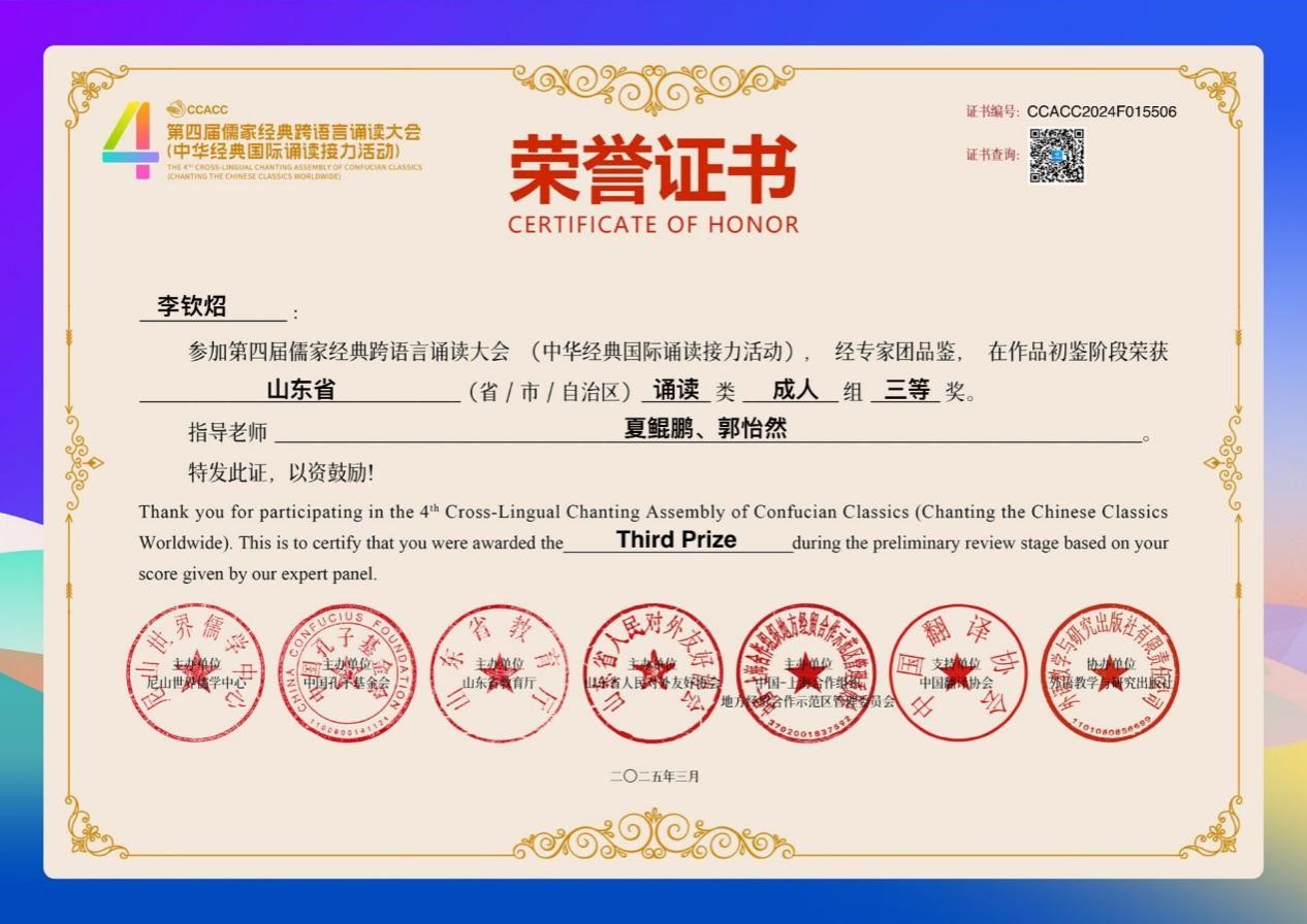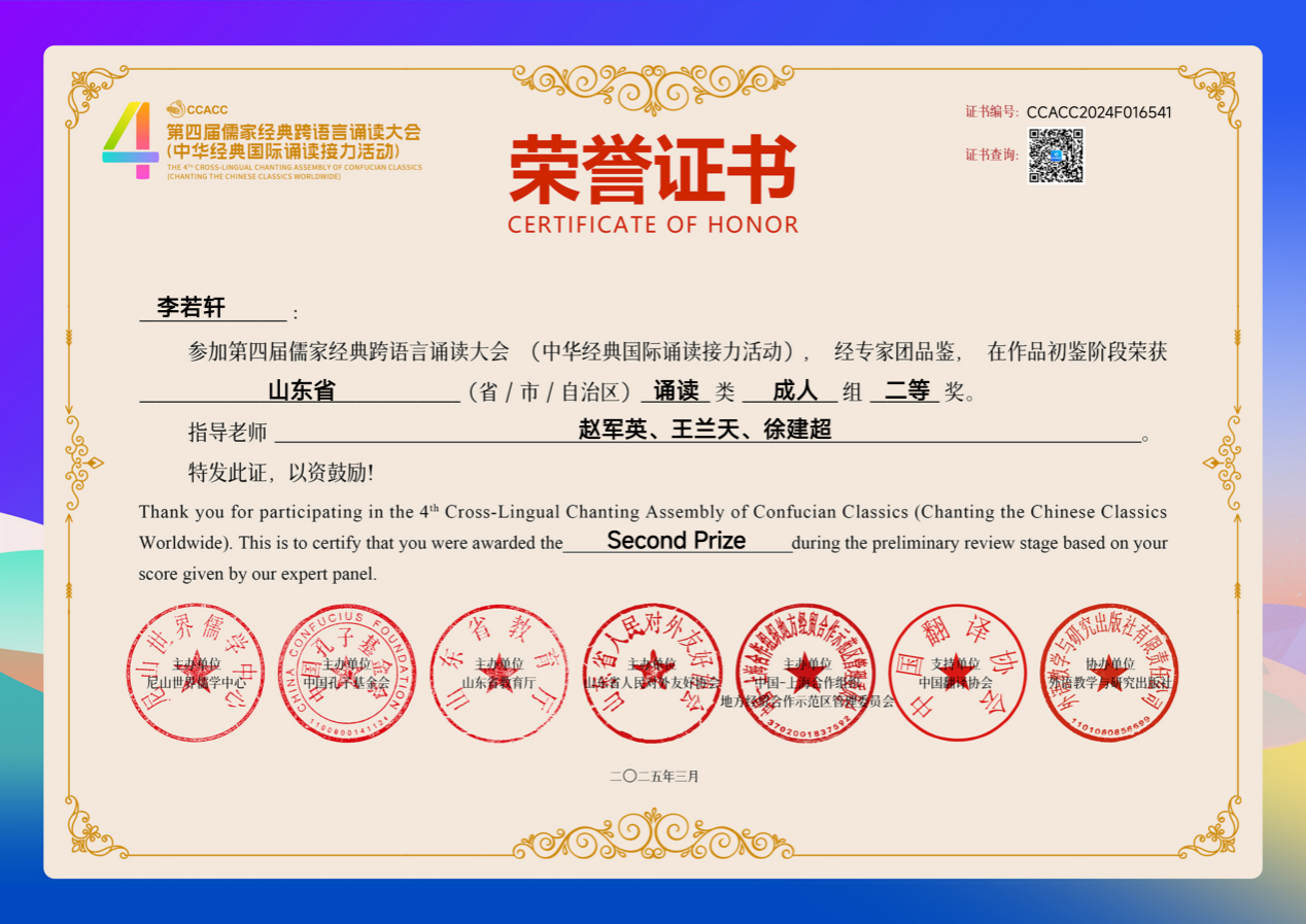 赵军英、王兰天、徐建超三位老师指导,李若轩、翟晨媛两位同学的参赛作品《华人好榜样——千秋巾帼之木兰》获得全国诵读类三等奖及山东省诵读类成人组二等奖;李淑青、赵军英两位老师指导,刘妍同学参赛作品《<论语>经典章句诵读》获得山东省诵读类成人组三等奖;夏鲲鹏、郭怡然两位老师指导,李钦炤同学以参赛作品《品读论语经典,学鉴孔子思想》获得山东省诵读类成人组三等奖;夏鲲鹏、钟先华两位老师指导,董子萱同学的参赛作品《<论语>中的“孝”》获得山东省诵读类成人组三等奖;钟先华、张凤萍、孔伟三位老师指导,马刘浩合同学的参赛作品《<论语>选诵》获得山东省诵读类成人组三等奖;李艳敏、刘洋两位老师指导,魏雨昕同学的作品《<论语>选诵》获得山东省诵读类成人组三等奖。
