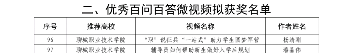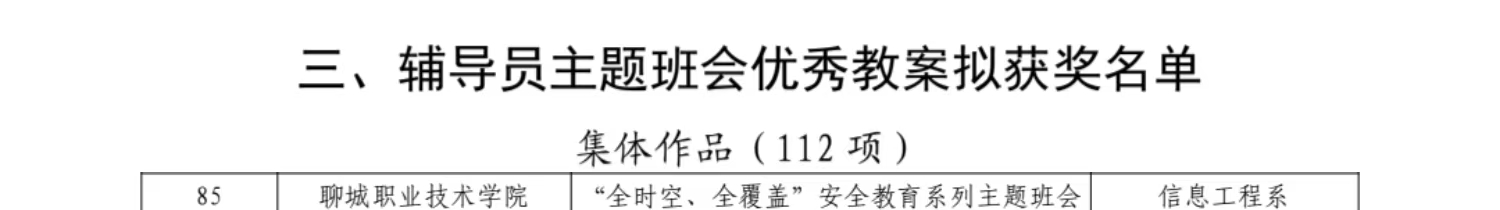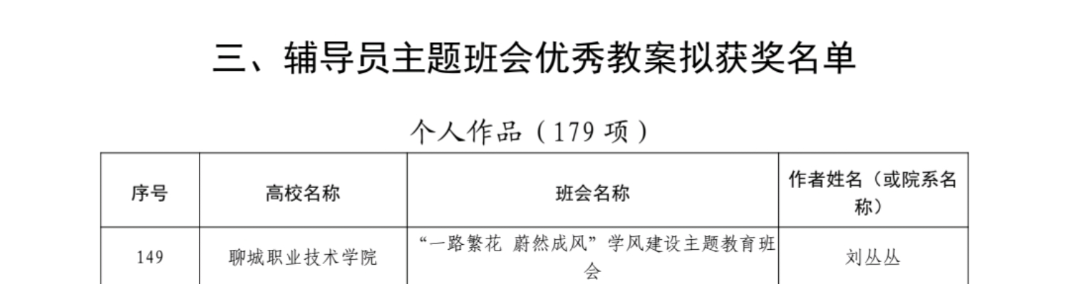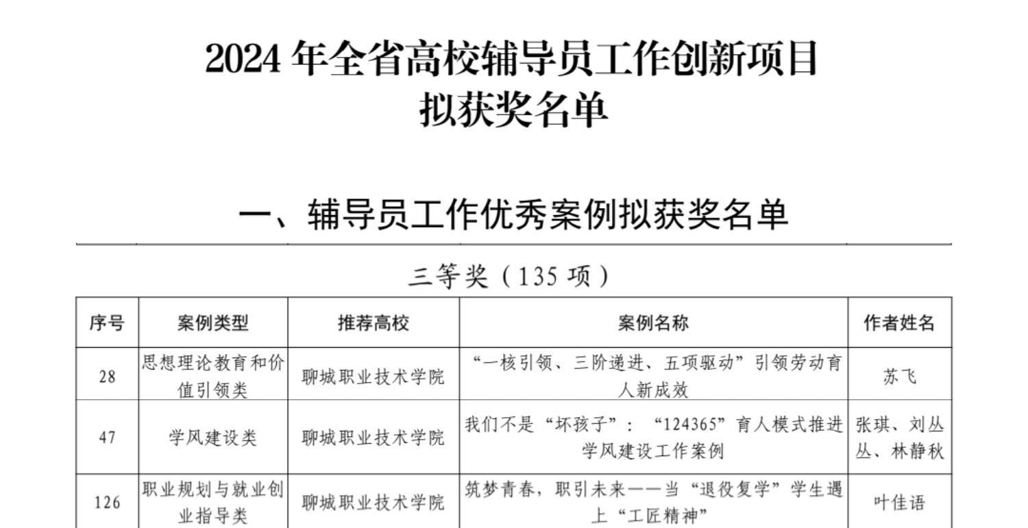 近日,山东省教育厅公布2024年全省高校辅导员工作创新项目评选结果,聊城职业技术学院申报的多个项目脱颖而出,荣获辅导员工作优秀案例三等奖3项;优秀百问百答微视频2部;获评辅导员主题班会优秀教案集体作品1项,个人作品1项。