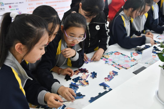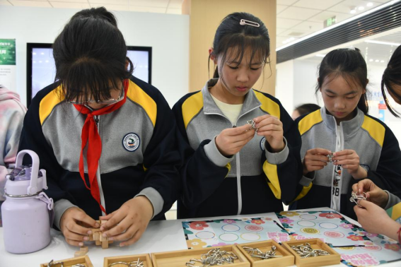 在老师们的引导下,小学生们兴致勃勃地参与了丰富多样的参观体验活动。在密码发展史展区,图文并茂的展板生动展现了密码从古代萌芽到现代加密技术的演变历程。最令孩子们兴奋的,是能够亲手体验一系列趣味游戏。大家围在展桌旁,专注地摆弄着猪圈密码卡片,通过图形符号的转换,尝试破译“密码”;面对九连环和鲁班锁,大家认真研究拆解,感受古人精巧的密码思维;拼图游戏则将密码知识融入其中,孩子们一边拼合图案,一边学习不同历史时期的密码应用案例。这些寓教于乐的体验,让孩子们仿佛穿越时空,亲眼见证古人的智慧如何应用于信息保密,现场充满了欢声笑语与热烈的讨论声。