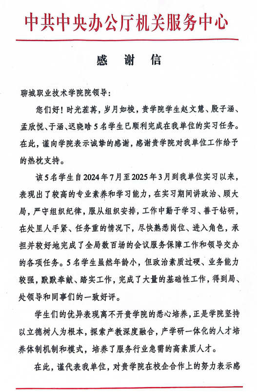 近日,聊城职业技术学院收到中共中央办公厅机关服务中心发来的感谢信,对我校文旅学院选派的赵文慧、殷子涵、孟欣悦、于涵、迟晓晗5名学生在实习期间的优异表现给予高度评价,对学校的人才培养工作致以诚挚谢意。