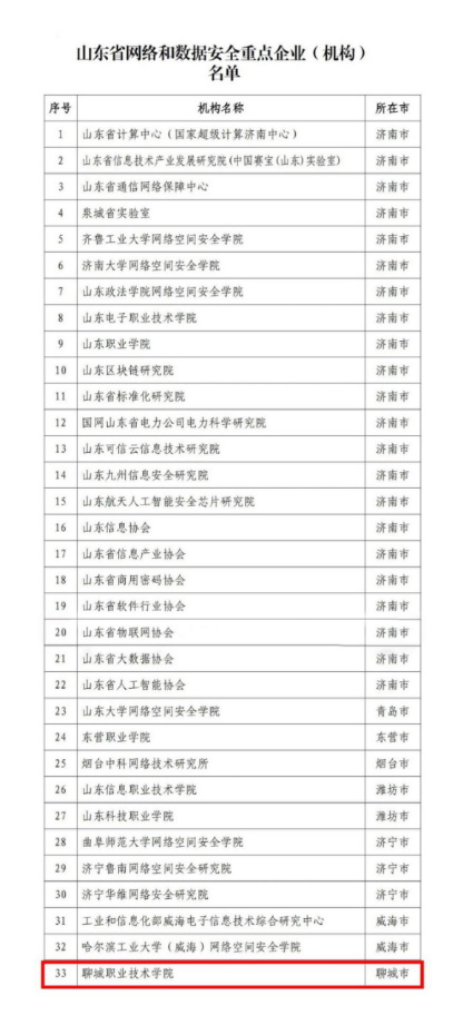 近日,中共山东省委网络安全和信息化委员会办公室、山东省工业和信息化厅联合发布了《关于山东省网络和数据安全重点企业(机构)名单的公示》,聊城职业技术学院凭借在网络安全人才培养、科研和社会服务方面的突出表现,成功入选山东省网络和数据安全重点机构名单,也是我市唯一一家入选该名单的机构。