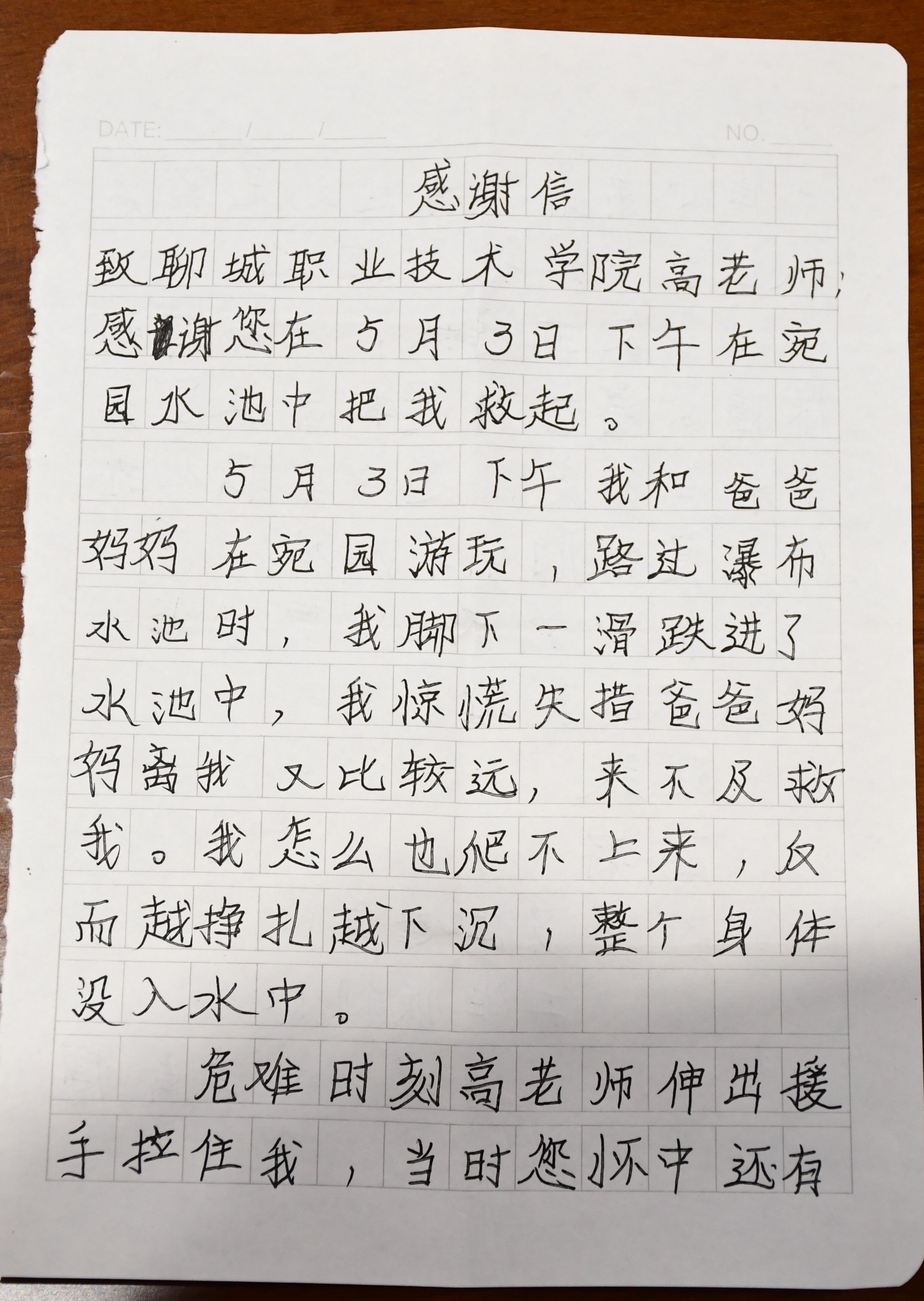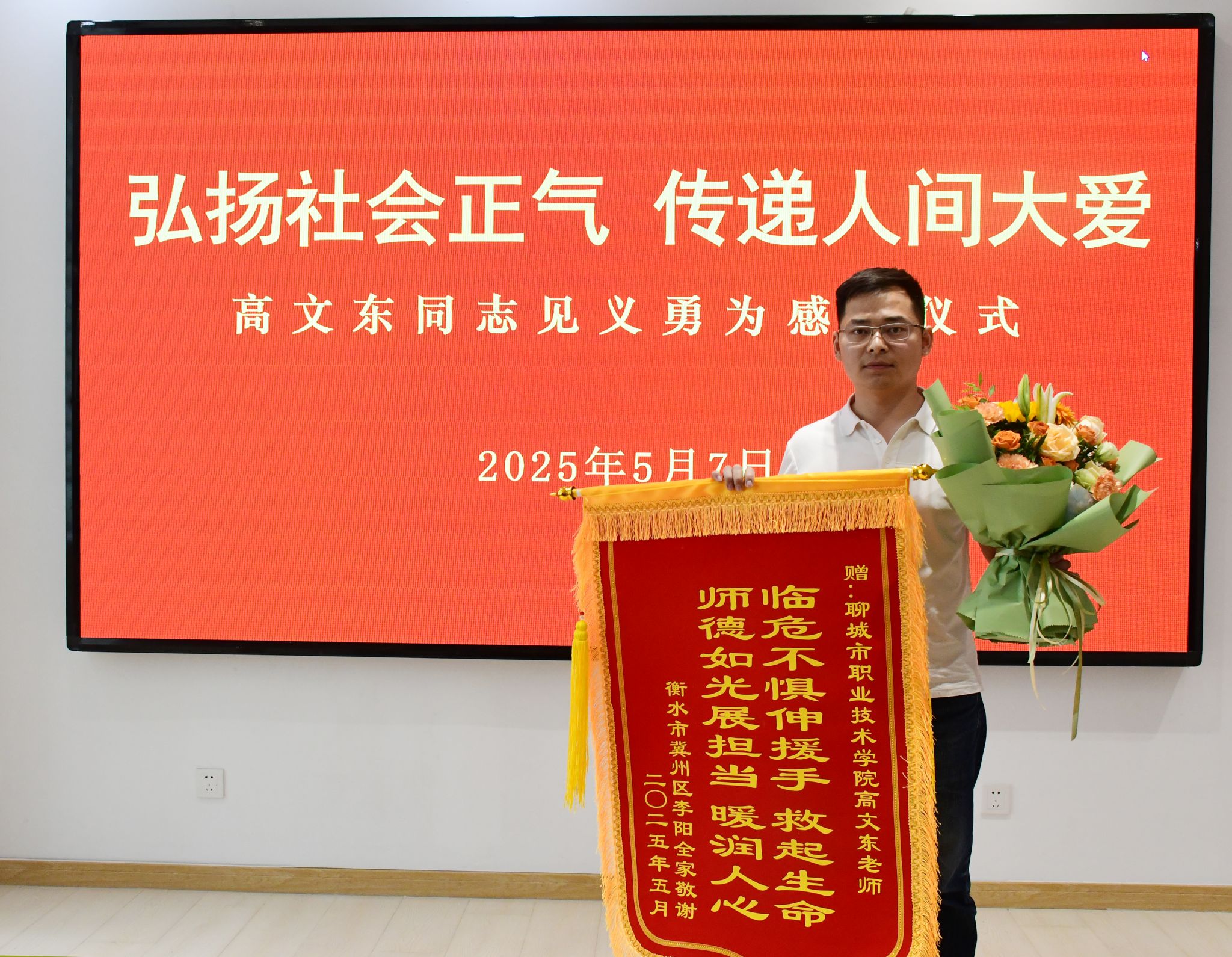 近日,聊城职业技术学院年轻教师高文东在危急时刻挺身而出,成功救下一名不慎落水的10岁男孩。5月7日,获救男孩的父母专程从河北衡水驱车来到学校,向高文东老师赠送锦旗并表达诚挚谢意。