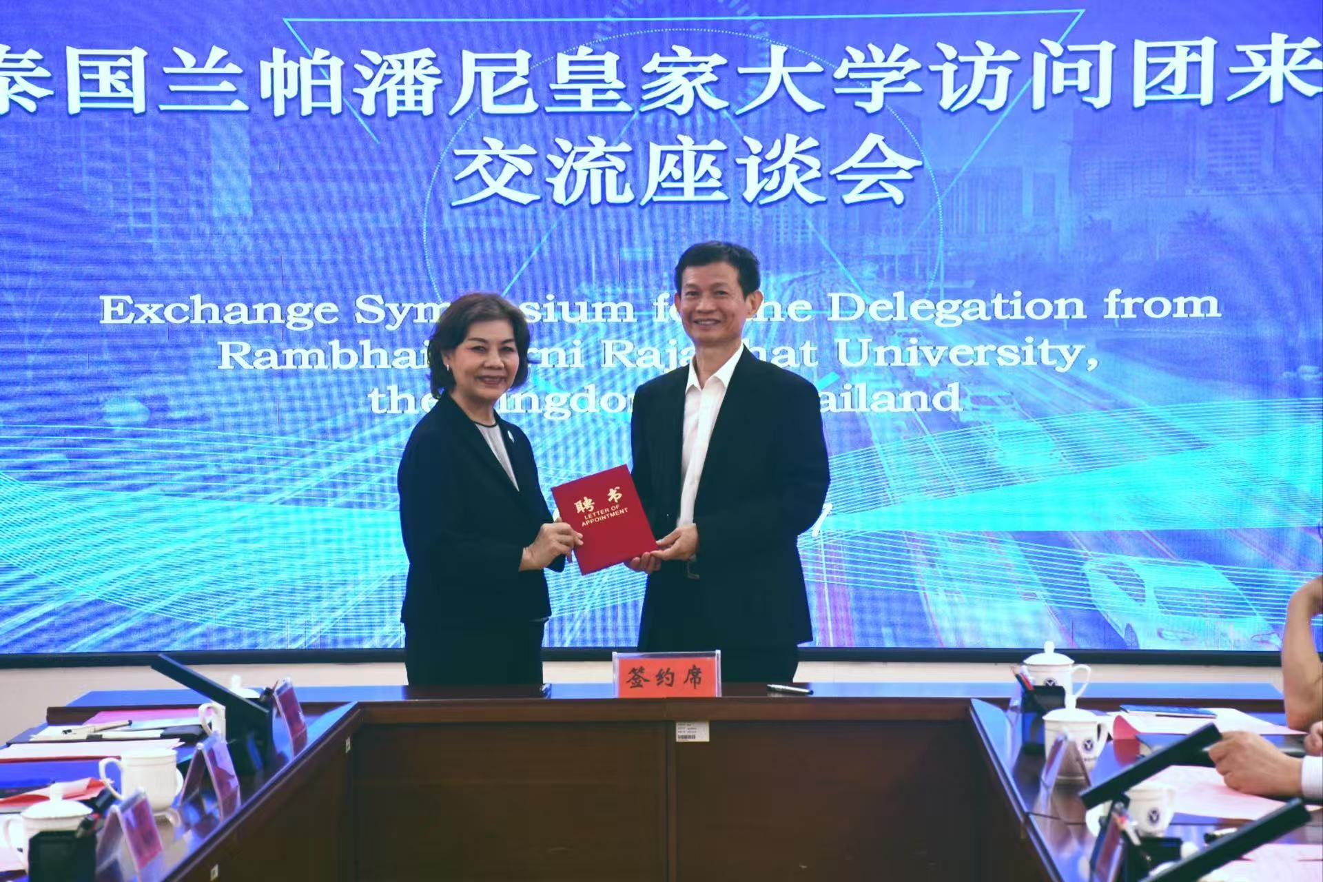 西纳·考斯蓝南(Sinat Koslanant)与刘雪巍代表双方签署合作备忘录。徐龙海为泰方10位专家学者颁发聘书,聘请他们担任学校客座教授,涵盖护理、教育、科学技术等多个领域,进一步强化了两校的学术交流纽带。