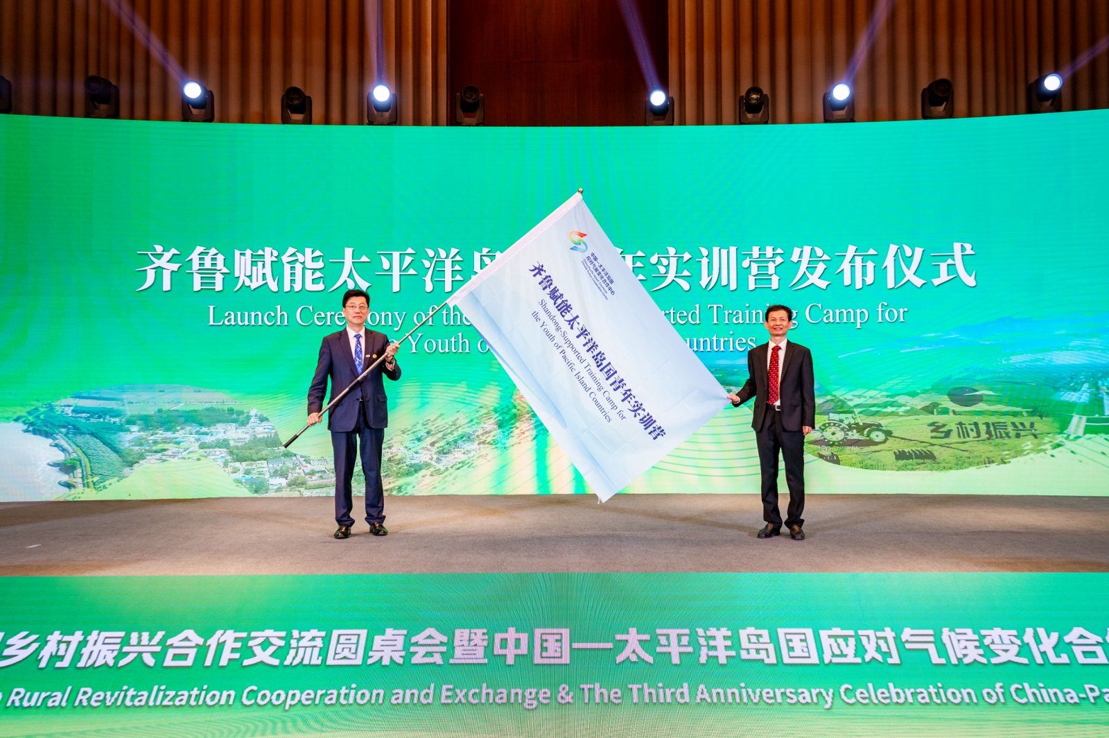 5月28日,中国(山东)—太平洋岛国乡村振兴合作交流圆桌会暨中国—太平洋岛国应对气候变化合作中心成立三周年庆祝活动在东阿县举行。来自中国与9个太平洋岛国的政府官员、专家学者及企业代表等120余人参加。省政协副主席程林、市委副书记、市长张百顺出席并致辞,省委外办副主任、一级巡视员李永森等领导参加活动。作为活动的重要环节,会上举行了“齐鲁赋能太平洋岛国青年实训营”发布仪式。聊城职业技术学院党委副书记、院长徐龙海代表学院上台参加授旗仪式,省委外办副主任、一级巡视员李永森向徐龙海授旗。