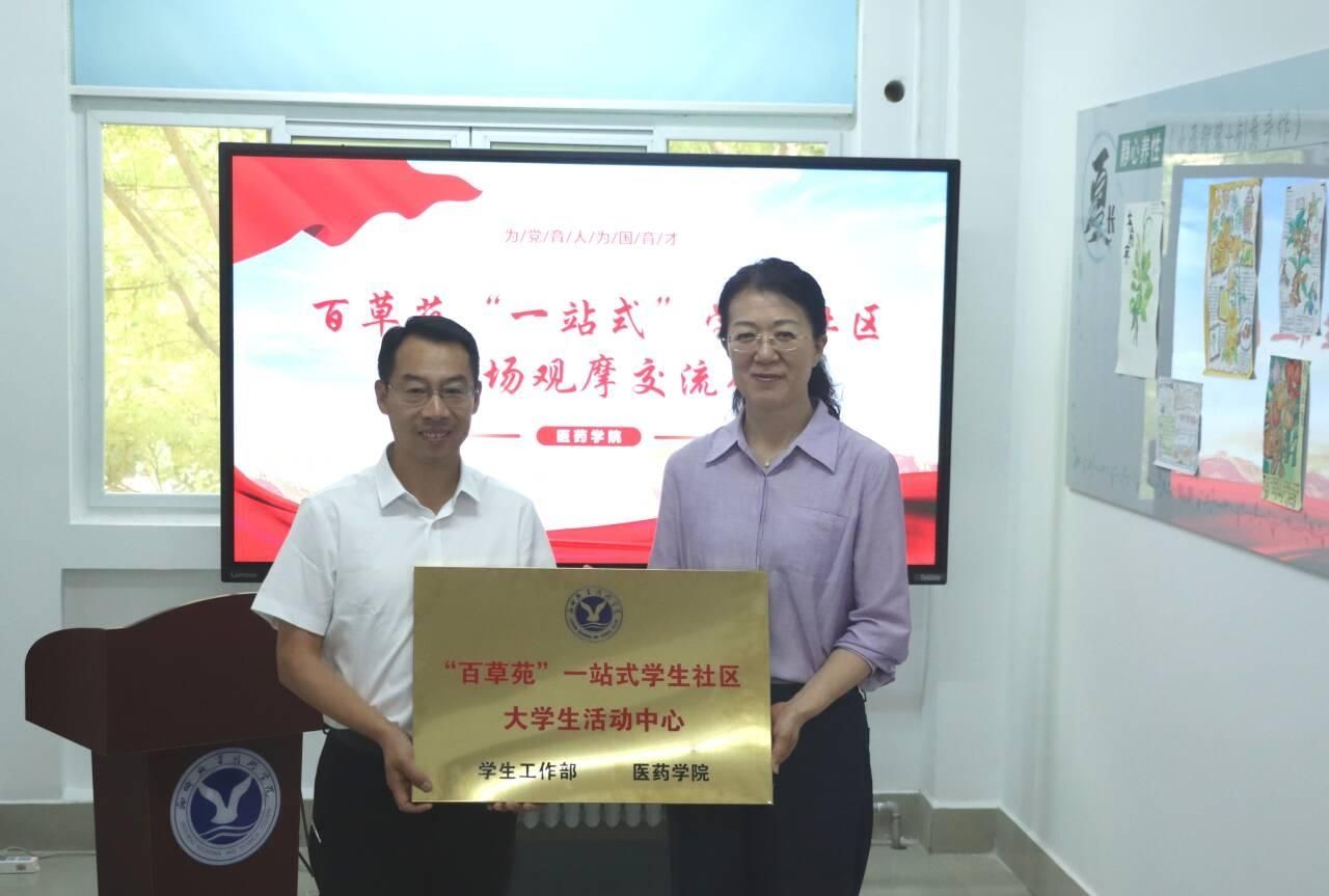 活动第二阶段,刘雪巍为百草苑“一站式”学生社区授牌。郭立栋为刘志辉、杜泽敏颁发“美育导师”聘书,李林为郭桂华、吴菲菲颁发“学业导师”聘书,李朝阳与5名学生进行了师徒结对。医药学院团总支书记王新介绍议程并深入阐述了百草苑“一站式”学生社区的建设意义与成效,团总支副书记林静秋对标《高校“一站式”学生社区综合管理模式建设提质增效指南》相关要求,从建设背景、建设情况、下一步发展规划等方面详细介绍了百草苑“一站式”学生社区建设和实施情况,学生干部代表刘欣雨分享了自己在“一站式”学生社区活动的成长感悟。与会人员就实地观摩与经验分享进行了讨论交流。