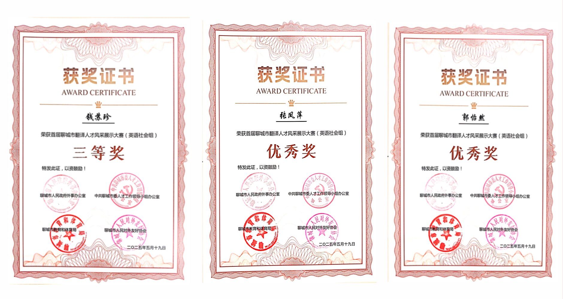 近日,首届聊城市翻译人才风采展示大赛圆满举办。在本次风采展示赛中,聊城职业技术学院1名教师荣获三等奖、2名教师荣获优秀奖。同时,学校基础部被授予优秀组织奖。获奖教师被纳入聊城市翻译人才库,进行重点培养,优先获得省级及以上同类比赛的聊城代表参赛权。