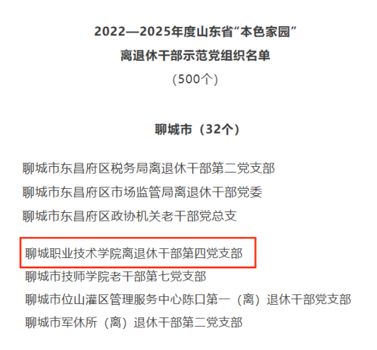 近日,聊城职业技术学院离退休干部第四党支部内强政治本色、外塑“银龄”样板,凭借扎实的党建工作和突出的示范引领作用,被评为2022—2025年度山东省“本色家园”离退休干部示范党组织。