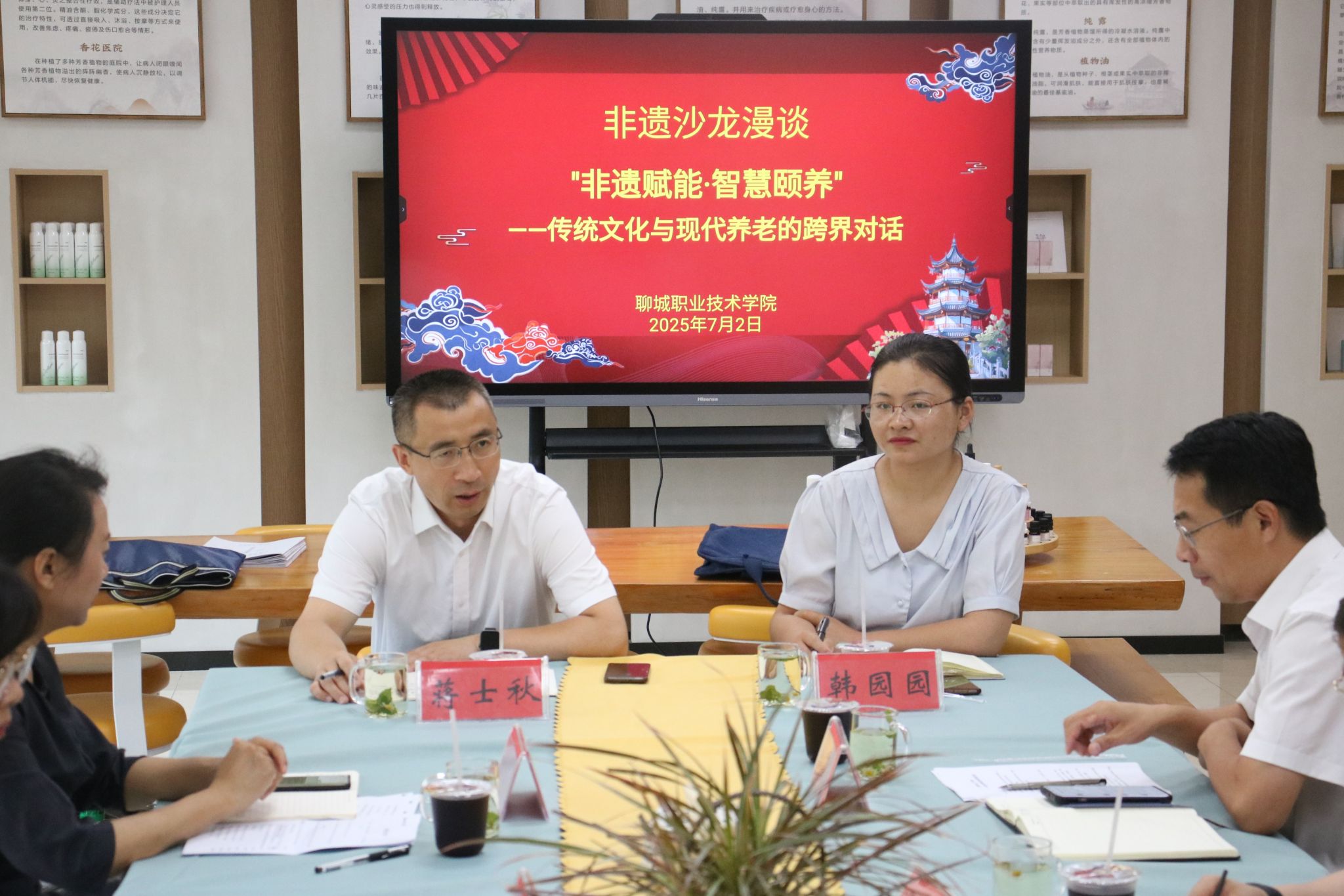如何让老年人不仅“老有所养”,更实现“老有所乐、老有所为”,成为全社会关注的焦点。7月2日,聊城职业技术学院举办“非遗赋能·智慧颐养——传统文化与现代养老的跨界对话”主题沙龙活动。山东省文化和旅游厅非物质文化遗产处副处长、聊城市文旅局副局长蒋士秋,聊城市中华职教社秘书处主任韩园园,非遗锤痧传承人李朝阳应邀出席活动。聊城职业技术学院医药学院党总支书记、副院长朱崇先,医药学院、健康护理学院、文旅学院师生代表齐聚一堂,共同探讨中医药非遗技艺与现代养老服务的融合发展路径。活动由文旅学院党总支书记、副院长王凯颖主持。