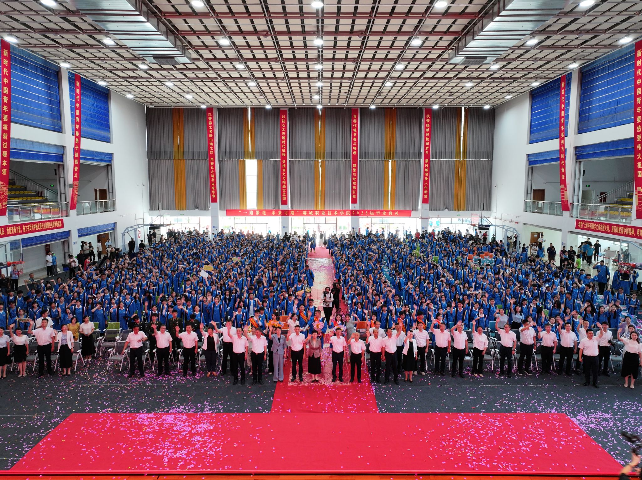 随着靳凤莲书记宣布聊城职业技术学院2025届毕业典礼圆满结束的声音,万千花瓣从天而降,呈现出一路繁花的景象,预示着2025届毕业生将在未来道路上一片坦途、一路繁花盛开。学校领导和二级学院负责人来到毕业生中间,在大家的簇拥中合影留念,定格下美好瞬间。