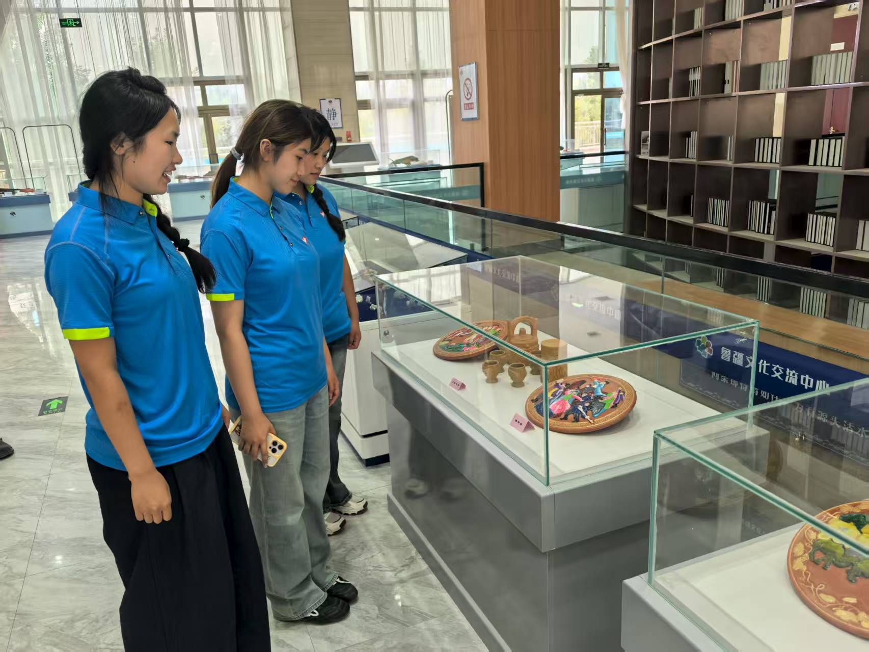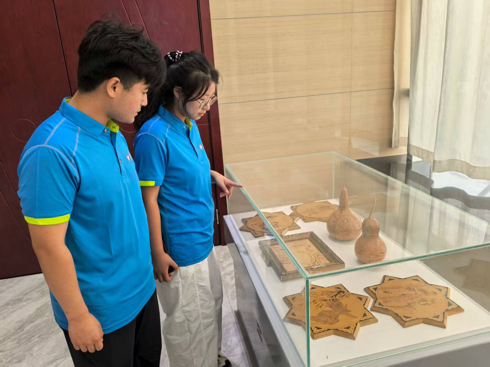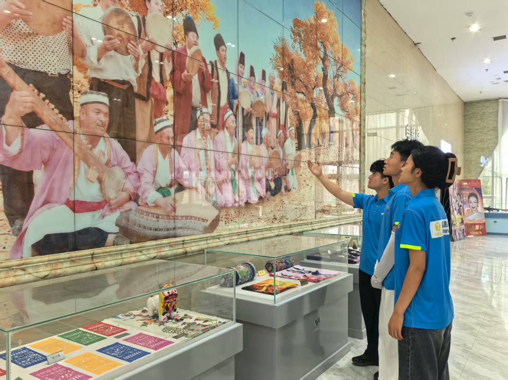 队员们先后参观了“鲁疆情深”主题展厅、非遗文化体验区等板块。在主题展厅,通过一张张珍贵的老照片、一件件见证协作的实物,队员们详细了解了山东对口支援麦盖提县以来,在教育帮扶、产业协作、民生改善等领域的生动实践,深刻体会到“鲁疆一家亲”的深厚情谊。在非遗文化体验区,队员们近距离感受了维吾尔族刺绣、民间乐器制作等非遗技艺的独特魅力,队员们不时地拿起手机,记录下这些珍贵的文化瞬间。