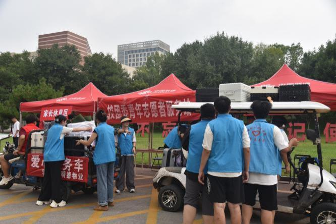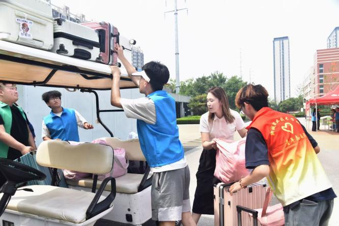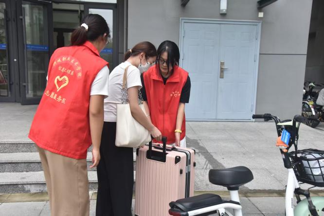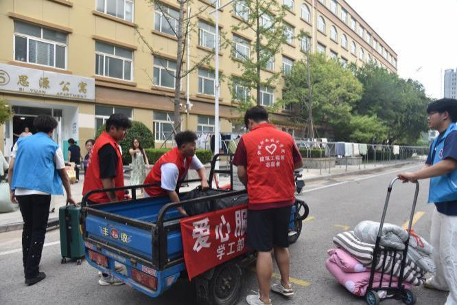 返校期间,身着统一服装的学生志愿者分布于校园主干道、宿舍区和教学楼等重点区域,设立清晰指引标识与服务站点,并贴心设置家长休息区与失物招领处,及时响应师生需求。他们热情主动地协助返校学生搬运行李、提供咨询与引导,并介绍新学期相关安排。