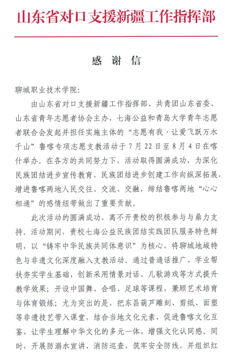 近日,聊城职业技术学院收到来自山东省对口支援新疆工作指挥部的感谢信,信中对学校“文艺轻骑兵”志愿支教队在“志愿有我·让爱飞跃万水千山”鲁喀专项志愿支教活动中的突出贡献给予肯定,对学校师生的无私奉献与专业服务表达诚挚谢意,为学校深化民族团结教育、助力鲁喀文化交融的实践成果再添亮色。