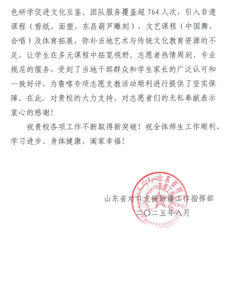 此次收到感谢信,不仅是对聊城职业技术学院支教工作的高度认可,更是对学校积极践行社会责任、助力民族团结进步事业的激励。未来,学校将继续发挥教育资源优势,持续深化与边疆地区的教育交流合作,创新志愿服务模式,为铸牢中华民族共同体意识、推动鲁喀两地共同发展贡献更多职教力量。