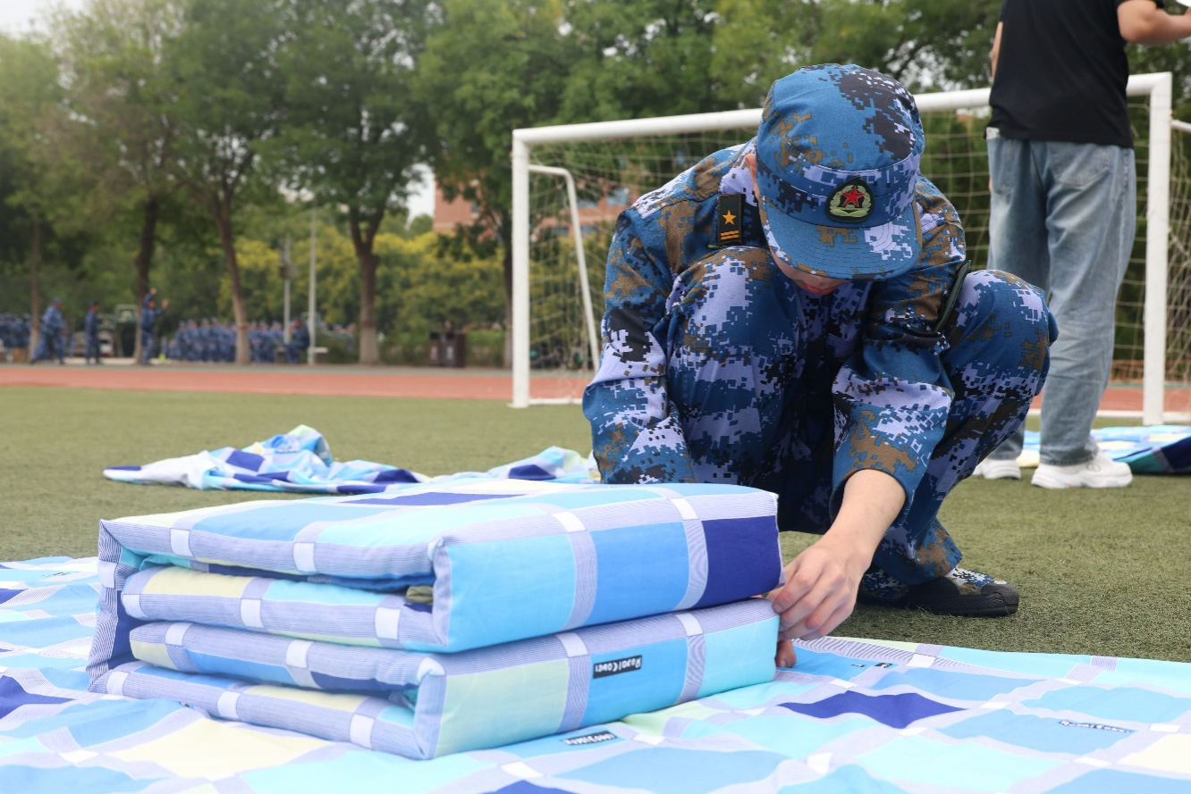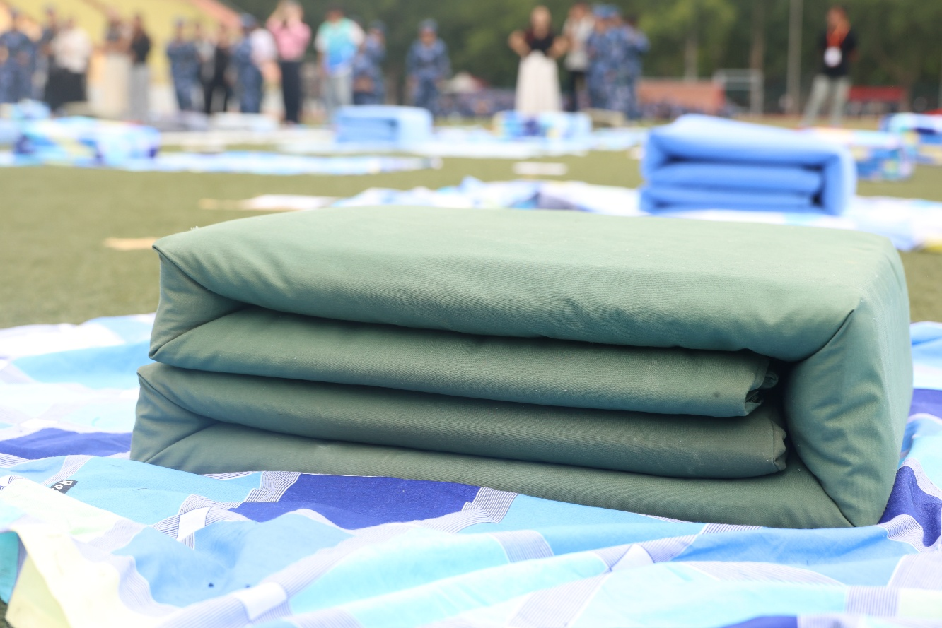 比赛结束后,评审团逐一“检阅”。他们从叠放规整度、边角处理精细度、整体美观度等维度打分,连床单褶皱是否对称、被角是否垂直等细节都不放过。最终脱颖而出的“标兵军被”,不仅是视觉上的“整齐美学”——床单平展无褶、被角棱角分明,更是他们对“自律即态度,细节见担当”的生动诠释。叠军被不是简单的叠被子,而是纪律意识的第一课。这些军被里藏着的,是新生们从松散到严整的蜕变,是他们用行动书写的“青春态”。