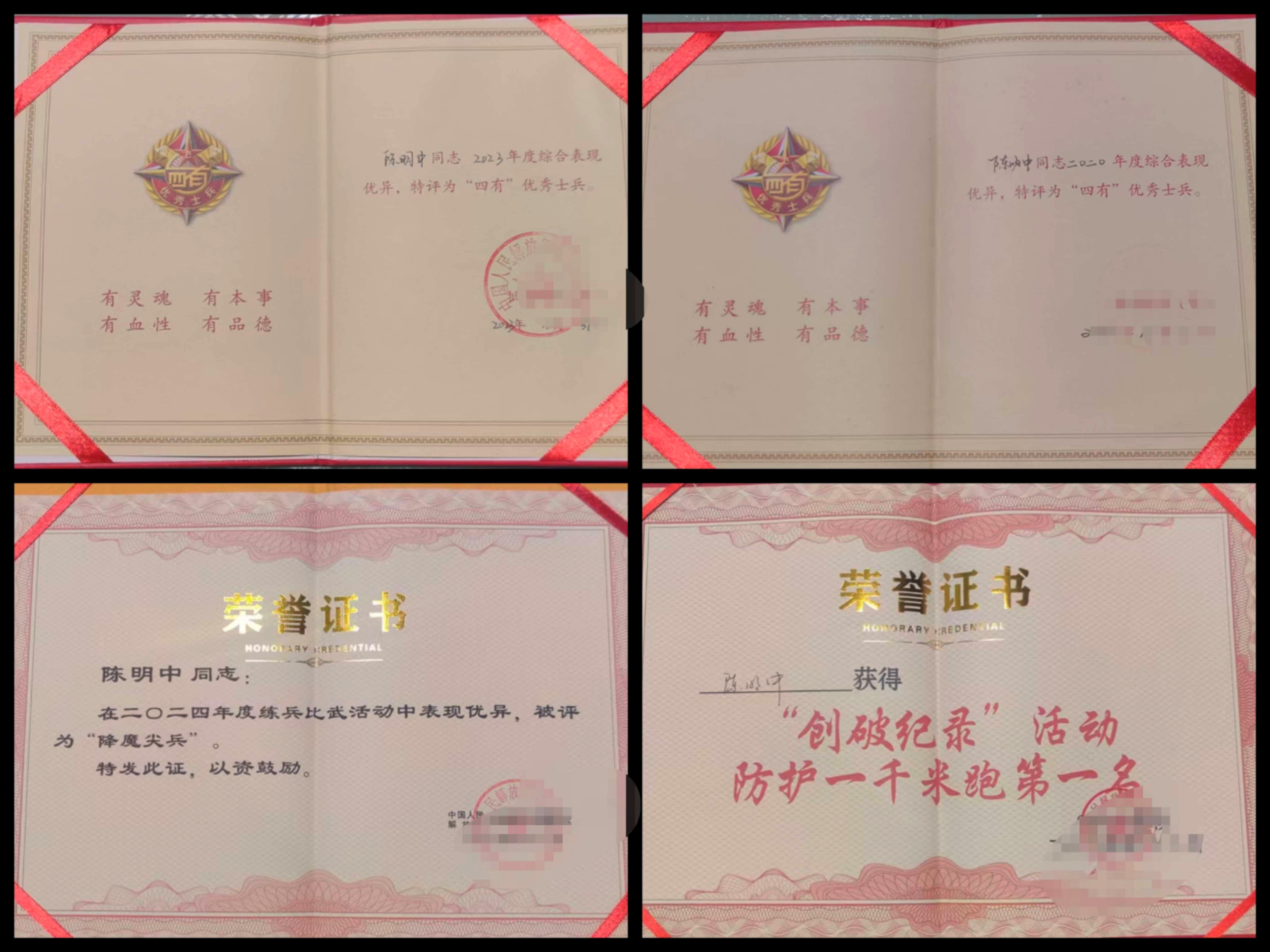 入伍后,陈明中全身心投入到艰苦的训练中,大量的射击训练导致他右耳神经性耳聋,但他并未因此退缩,反而以更坚定的信念和更刻苦的精神投入到训练中,最终获得集体二等奖。服役6年来,陈明中屡次获得“四有”优秀士兵、练兵比武“降魔尖兵”等荣誉称号,2021年和2023年分别赴陆军特种学院和陆军防化学院学习。