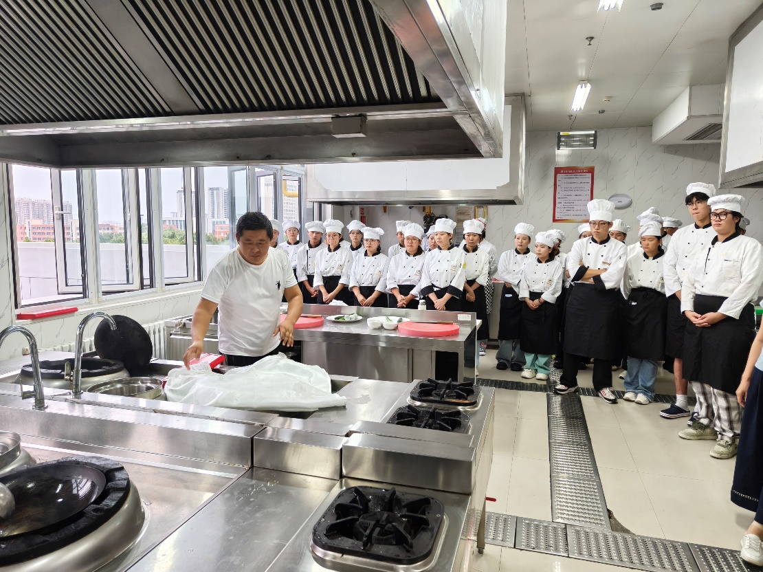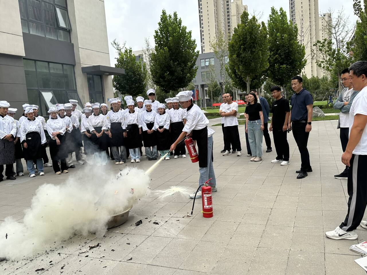现场演练第一轮,重点围绕北校区文旅学院烹饪实训室消防安全、烹饪教学过程中引发失火的自救方法以及逃生应急处理等内容展开,北校区所有实训室安全管理人员和文旅学院师生参加演练。