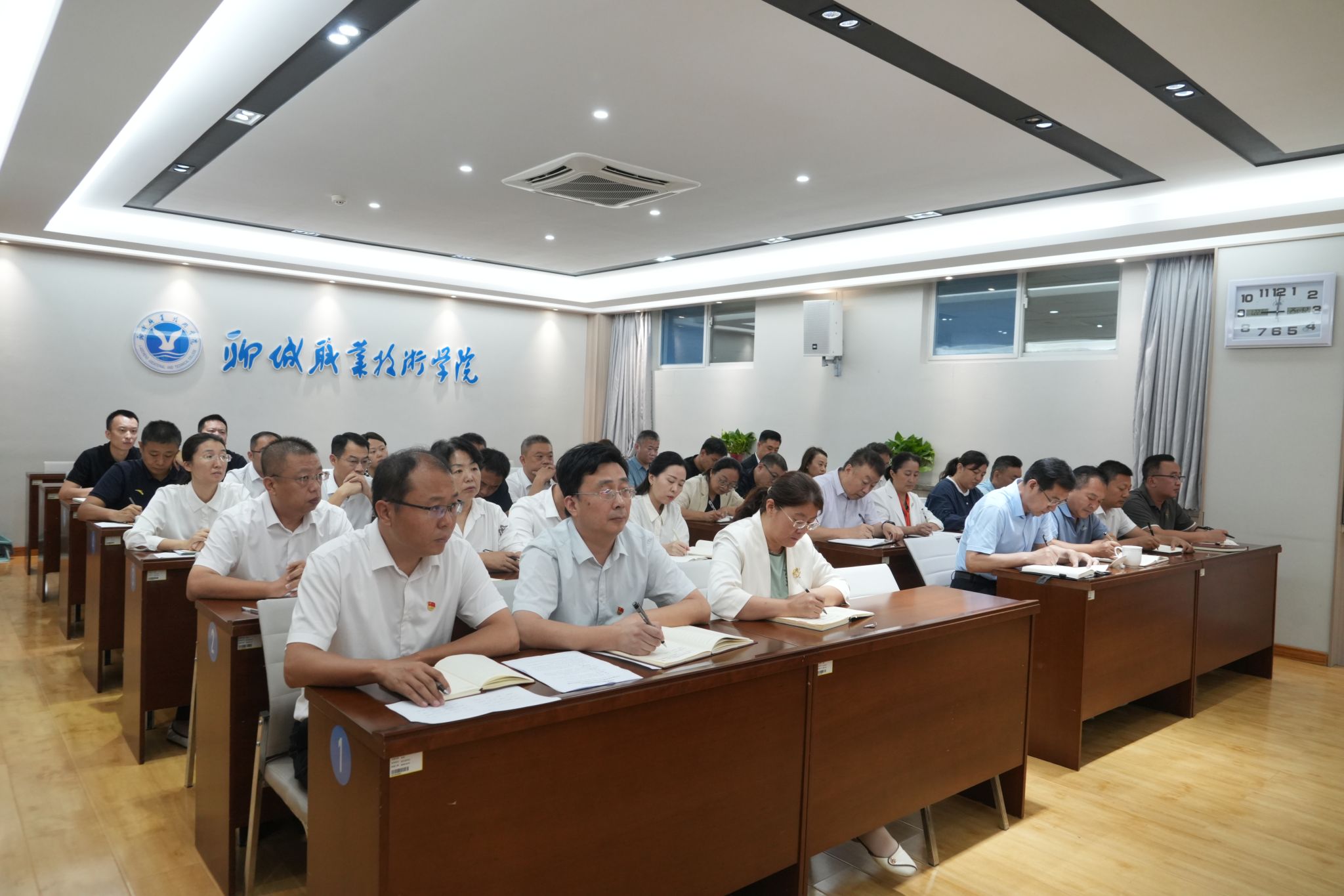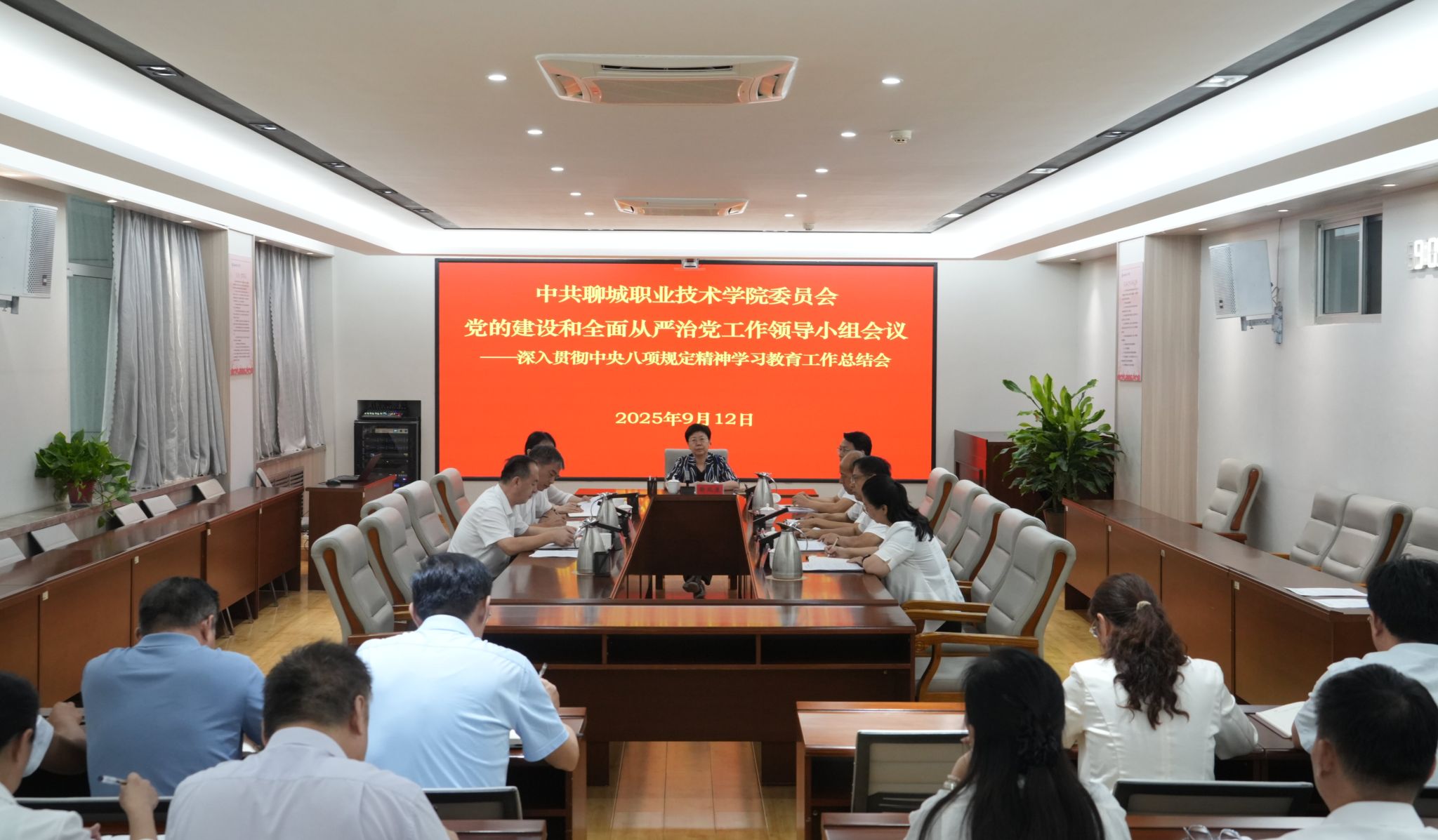9月12日,聊城职业技术学院召开党的建设和全面从严治党工作领导小组会议暨深入贯彻中央八项规定精神学习教育工作总结会,传达学习习近平总书记关于深入贯彻中央八项规定精神学习教育的重要指示精神和习近平总书记近期重要讲话精神,传达学习聊城市委常委会会议暨市委党的建设工作领导小组会议精神,听取学校学习教育工作总结汇报,安排部署下步工作。