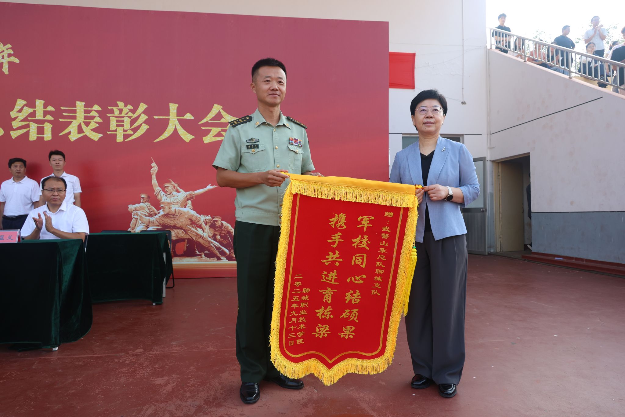 党委书记靳凤莲代表学校向承训部队赠送锦旗,对承训部队和全体教官的辛勤付出表示衷心感谢。