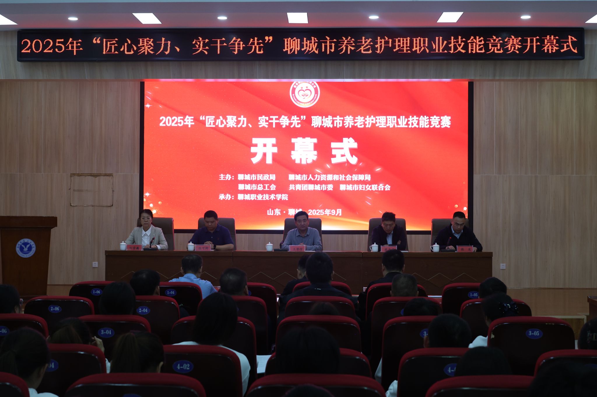 9月22日,2025年“匠心聚力、实干争先”聊城市养老护理职业技能竞赛在聊城职业技术学院正式拉开帷幕。本次竞赛汇聚了来自全市各区县及市属养老机构的50名优秀选手及相关领队。聊城市民政局党组成员、聊城市慈善总会办公室主任王登信,聊城团市委副书记蔡志睿,聊城市人力资源社会保障局职业能力建设科科长张可卿等出席开幕式。党委委员、副院长刘雪巍出席并致辞。开幕式由聊城市民政局养老服务科科长韩龙主持。