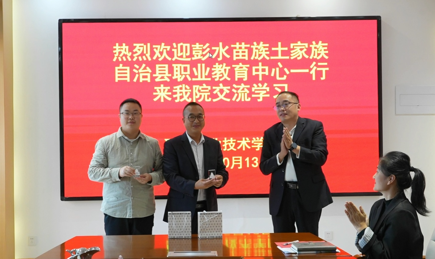 孙华祥对两位老师的到来表示欢迎,他详细介绍了学校的发展概况与办学成果,希望双方开展更深层次、更宽领域的务实合作,携手共进,优势互补,共同探索东西部职业院校协同发展的新路径,书写职业教育高质量发展的新篇章。智能制造学院党总支书记、院长张凤军介绍了本次交流学习的计划安排,智能制造学院副书记任伟向两位老师赠送了学生制作的文创作品。