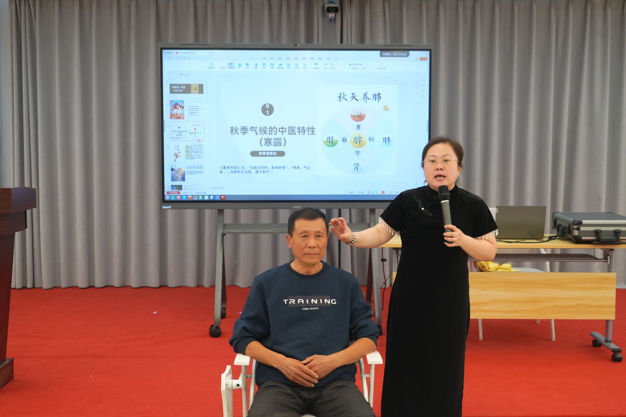 第一讲由李朝阳担任主讲。李朝阳,山东第一医科大学附属颈肩腰腿疼痛医院主任,“锤痧理筋正骨疗法”传承人葛洪养生术功法、善用点穴太极刮痧疗法以及锤痧理筋正骨疗法非遗传承人,聊城职业技术学院客座教授。讲座中,她围绕老年群体最关心的话题,从秋季气候的中医特性、秋季易发肺部疾病及中医治疗等五个方面为老年学员进行了详细的健康知识科普。