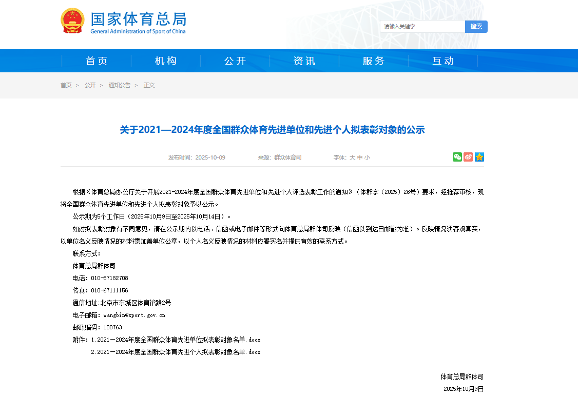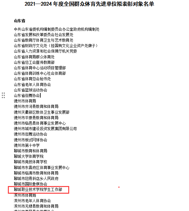 近日,国家体育总局公示2021-2024年度全国群众体育先进单位和先进个人评选表彰对象。聊城职业技术学院学生工作部作为学校立德树人、“五育并举”的牵头单位,凭借在群众体育工作中的突出成效和创新实践,入选“全国群众体育先进单位”。