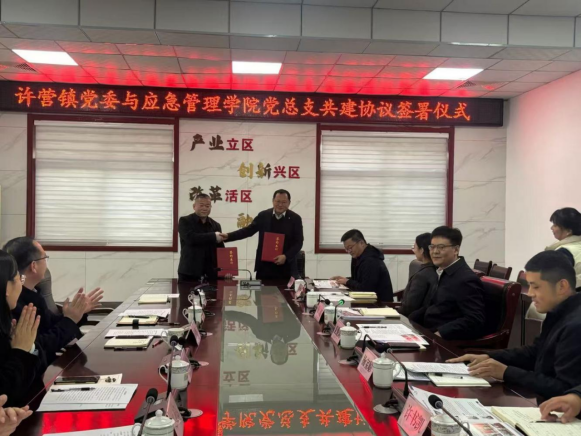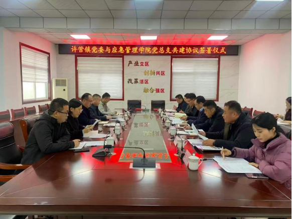 学校挂职干部、许营镇党委副书记杨超与应急管理学院党总支书记张延栋分别介绍了许营镇和学校的基本情况与发展特色。许营镇党委书记夏爱兵和张延栋签署了合作协议,标志着校地合作正式进入新阶段。