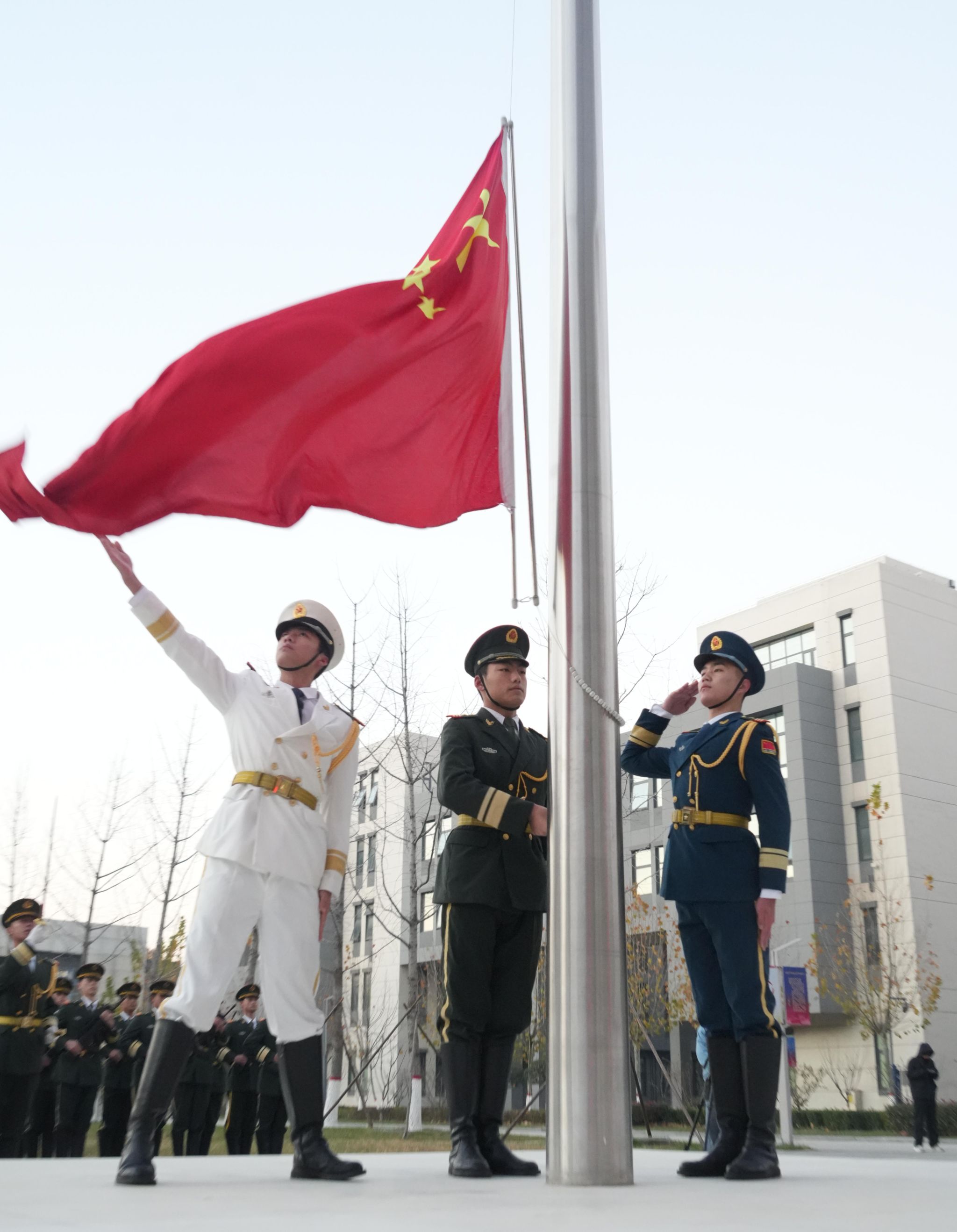 清晨七点,北校区图书馆前,师生代表整齐列队。伴随着雄壮的《义勇军进行曲》,五星红旗冉冉升起,迎风飘扬。全体师生面向国旗行注目礼,致以最崇高的敬意。升旗仪式后,组织开展“宪法晨读”活动。师生们齐声诵读宪法条文,以诵读形式推进宪法知识入脑入心,厚植法治情怀。