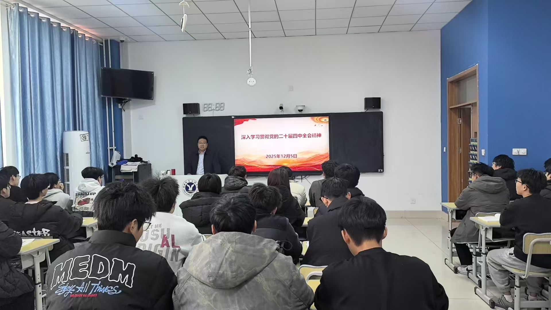 为引导青年学生深刻领会党的二十届四中全会精神,12月5日,党委副书记、院长崔巍以“深入学习贯彻党的二十届四中全会精神”为题,为智能制造学院2025级工业互联网一班学生讲授形势与政策课。课程围绕全会核心内容展开,结合时代背景与学生实际,通过理论阐释、案例分析和互动交流,激励青年学子勇担时代使命。