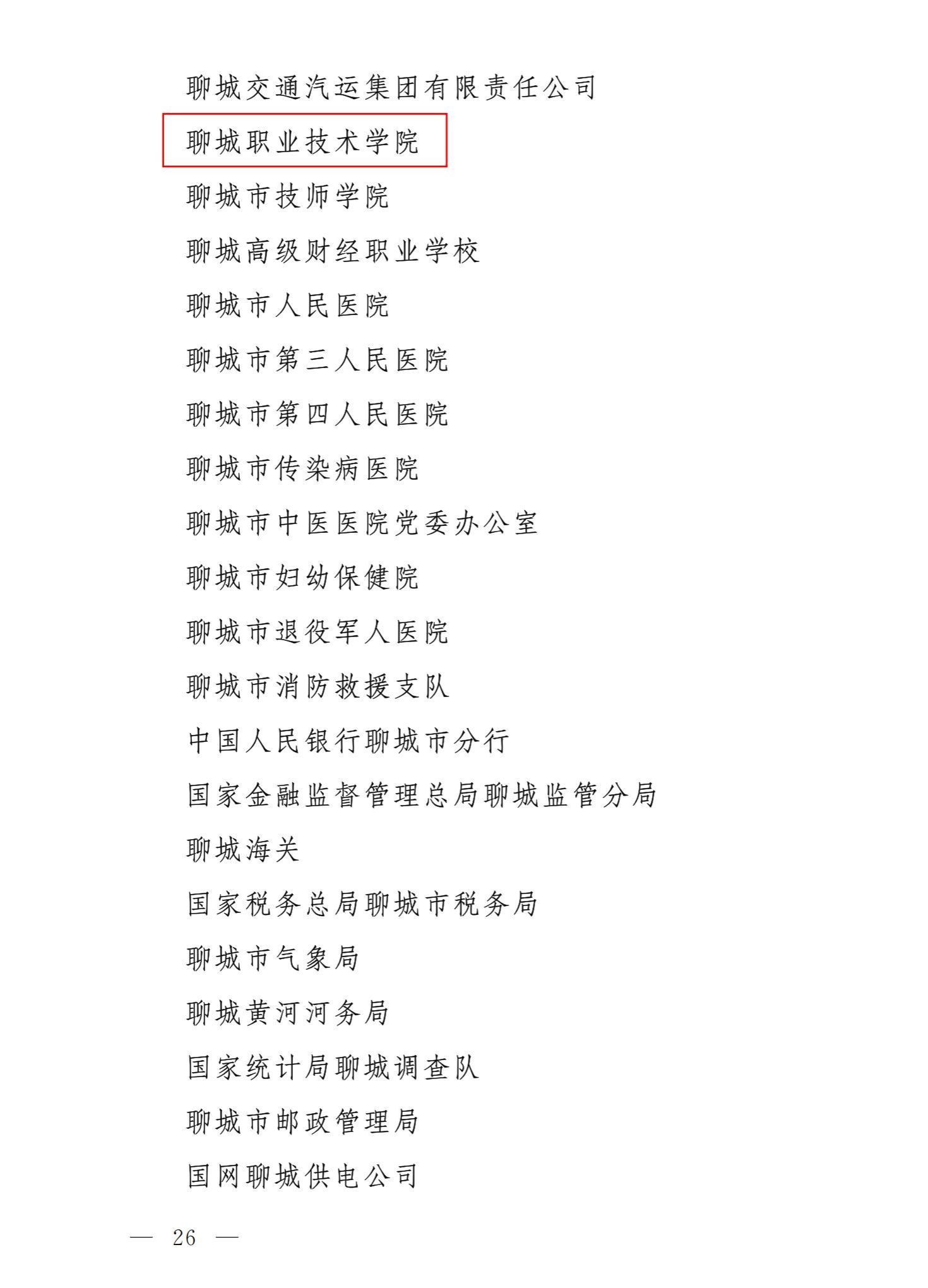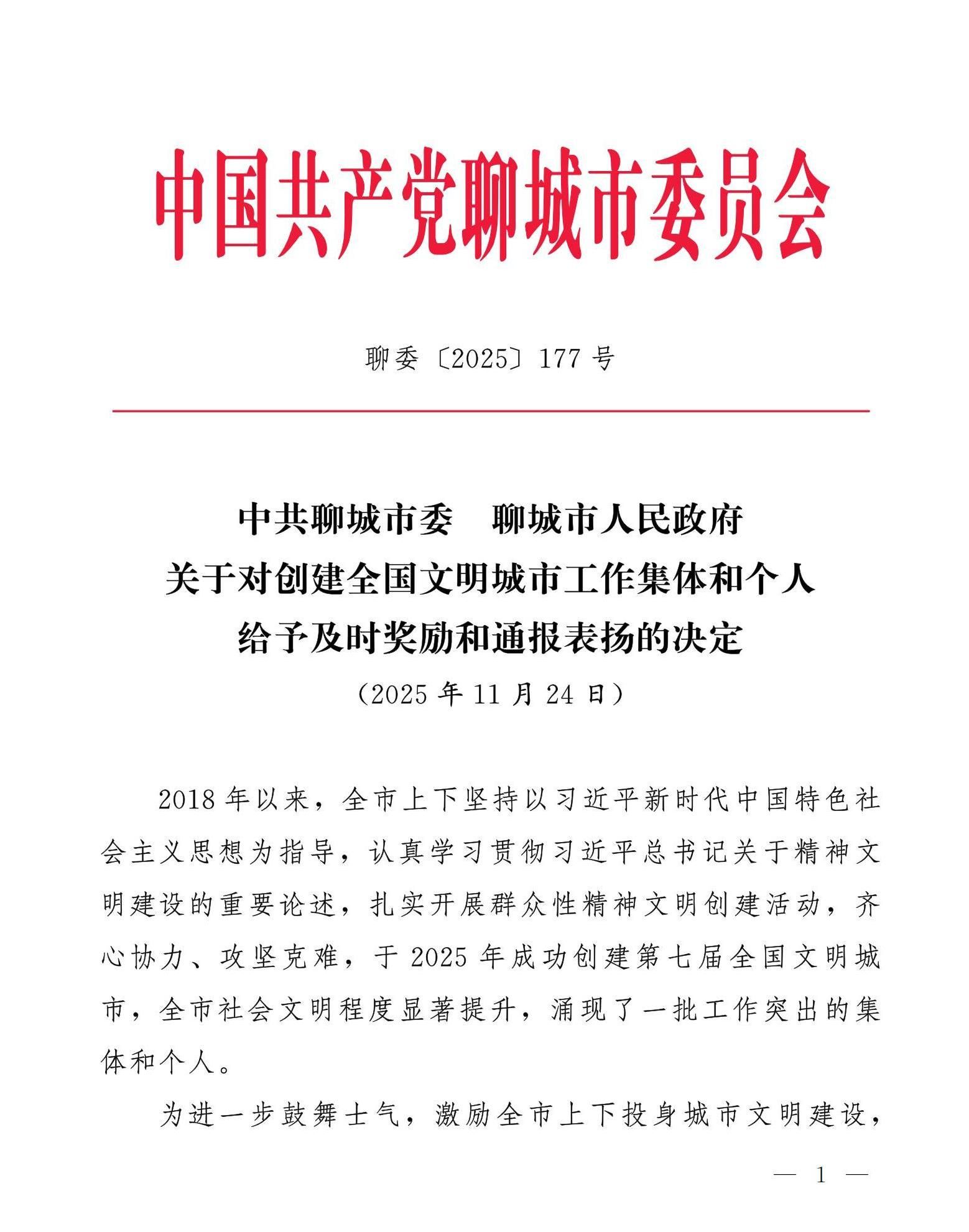 近日,聊城市委印发《中共聊城市委 聊城市人民政府关于对创建全国文明城市工作集体和个人给予及时奖励和通报表扬的决定》(聊委〔2025〕177号),聊城职业技术学院凭借在创建全国文明城市工作中的卓越表现荣获“聊城市创建全国文明城市工作通报表扬集体”称号。这一殊荣,是对学校长期以来积极投身城市文明建设、践行社会责任的高度肯定与嘉奖。