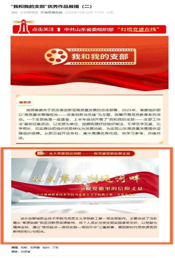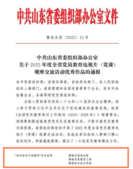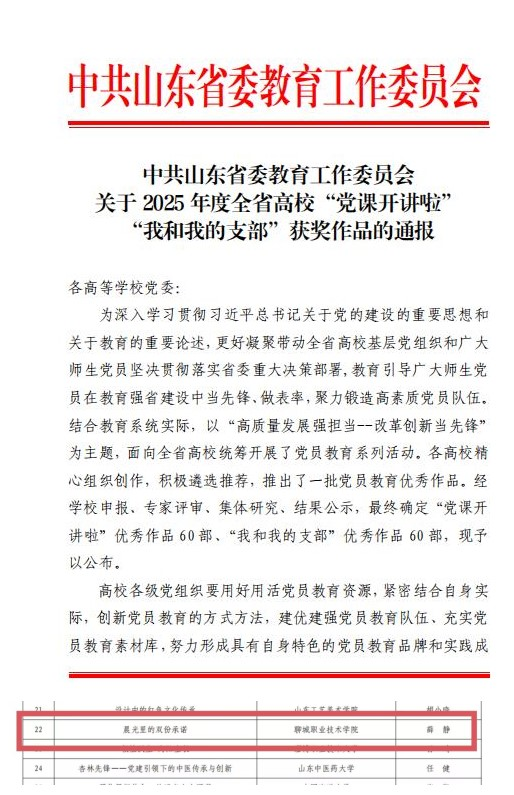 近日,在全省组织开展的党员教育系列活动中,中共山东省委组织部、中共山东省委教育工作委员会相继公布优秀作品展播与评选结果,聊城职业技术学院选送的作品在3项省级评选中均获佳绩。