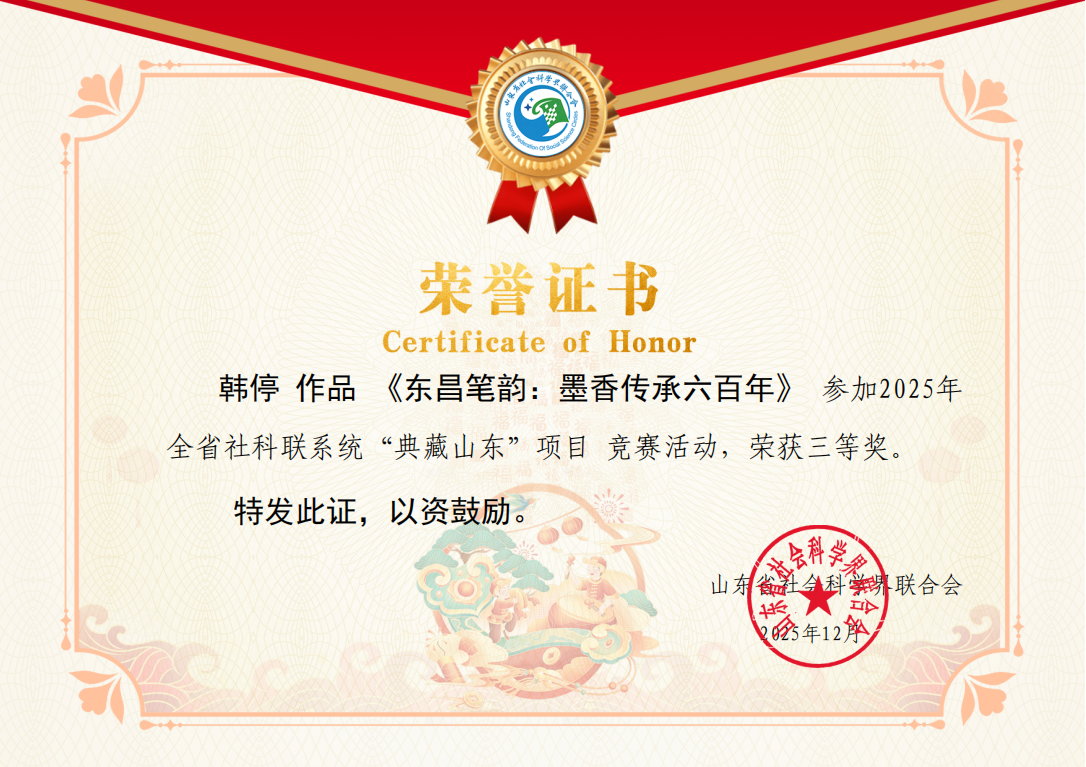近日,由山东省社科联主办的全省社科联系统“典藏山东”项目竞赛结果正式公布,聊城共5项作品获奖。其中,聊城职业技术学院马克思主义学院教师韩停执笔、聊城市社科联报送的作品《东昌笔韵:墨香传承六百年》荣获纪录片脚本组三等奖。