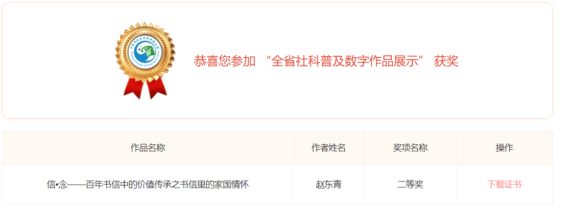 近日,在山东省社科联公布的社科普及数字作品征集展示活动获奖名单中,聊城职业技术学院马克思主义学院报送的《信·念——百年书信中的价值传承之书信里的家国情怀》数字作品荣获二等奖。