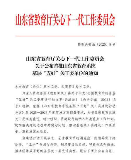 此次评选旨在深入贯彻落实教育部关工委相关文件精神及据《山东省教育系统基层“五好”关工委建设行动方案》,通过树立典型、表彰先进,推动全省教育系统基层关工委组织建设提质增效。评选严格依据“领导班子建设好、‘五老’作用发挥好、制度建设执行好、积极探索创新好、活动经常效果好”的“五好”标准,经单位自查、逐级推荐、严格审核等程序最终认定。